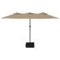 This elegant double-head parasol with LEDs is a perfect choice for creating some shade and protecting you from the sun's harmful UV rays. Durable material: Made of UV-protective and anti-fade polyester, the garden parasol provides you with optimum protection against the sun and is easy to clean.Sturdy frame: The strong powder-coated iron pole, along with durable ribs, makes the garden umbrella very stable and sturdy.Bright LED lights: The integrated LED lights of the umbrella illuminate your outdoor living space and create a cosy and romantic ambience when the sun goes down.Crank mechanism: Thanks to the crank mechanism, the umbrella can be easily opened and closed.Strong base: The base with the sandbag makes sure the parasol is sturdy and stable even in strong wind and heavy rain.