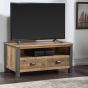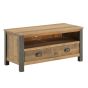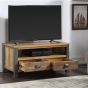 Introducing our charming TV cabinet from the divine Doyle Elegance range. This versatile piece serves as both a TV cabinet and AV unit, featuring an open shelf and two spacious storage drawers. Crafted with sturdy reclaimed rough sawn wood and accented by a distressed, powder-coated steel frame, this cabinet exudes rustic charm with an industrial edge. Each item in the range is hand-finished by skilled craftsmen, ensuring that every piece is truly unique.