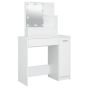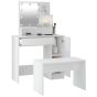 The trendy dressing table set gives your bedroom a timeless, refined look. The dressing table set with LED is a perfect addition to your bedroom decor and also keeps your cosmetics close at hand! Stable material: The engineered wood is of exceptional quality with smooth surface and also features strength, stability and resistance to moisture.Utility mirror: The dressing table with mirror is perfect for your daily beauty routine. The mirror allows you to take care of your facial skin and wear your makeup too!Ample storage space: The dressing table with stool provides ample space for easy access to your make-up, jewellery and everyday essentials.LED light: The dressing table also has LED bulbs with USB, which are easy to switch modes from warm to cold white. The featured LED bulbs around mirror illuminate your beauty as well.