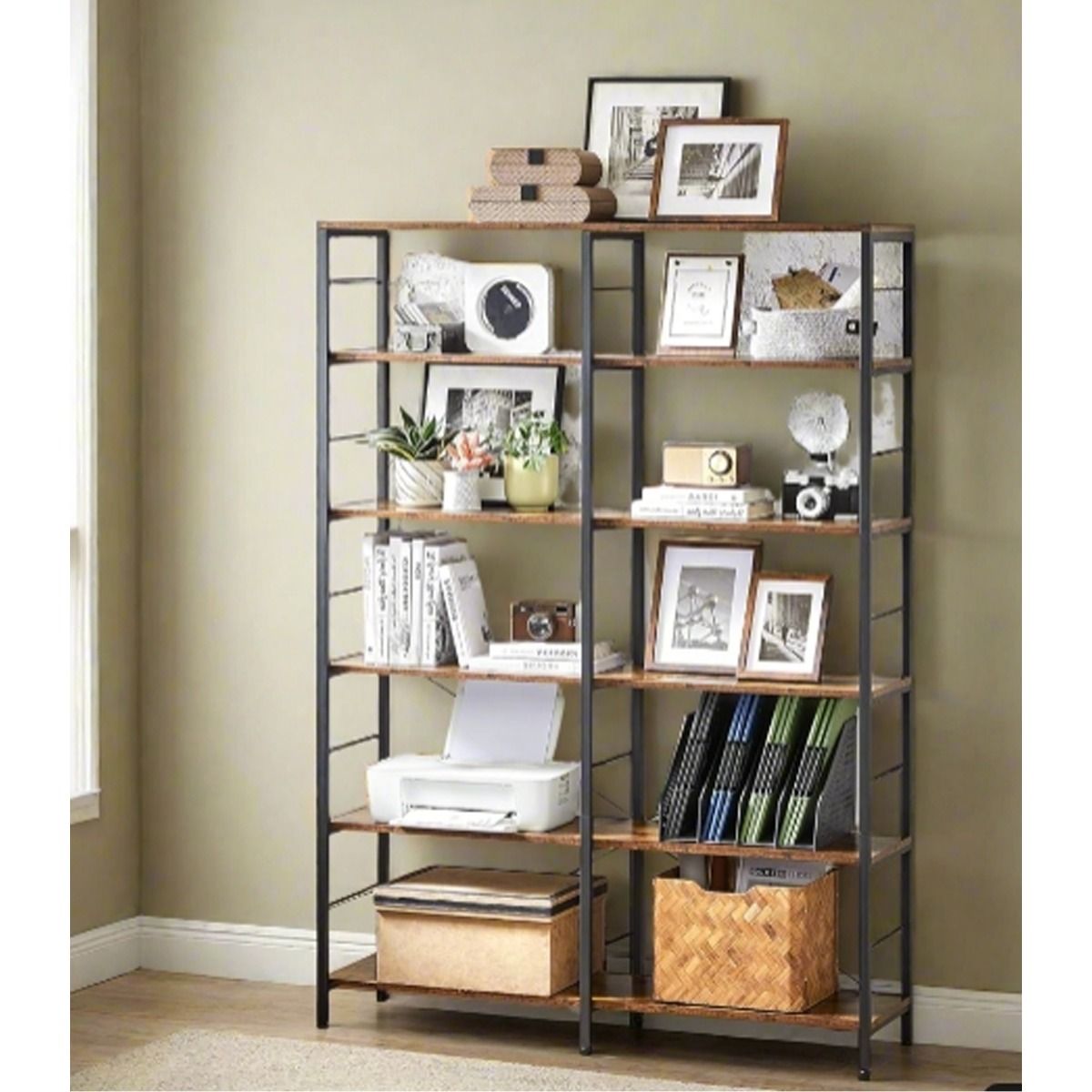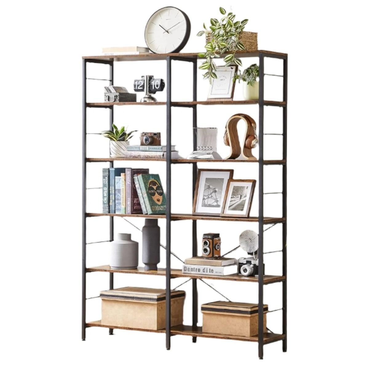 DREVONA Bookshelf 6-Tier Bookcase with Steel Frame - Rustic Brown and Black