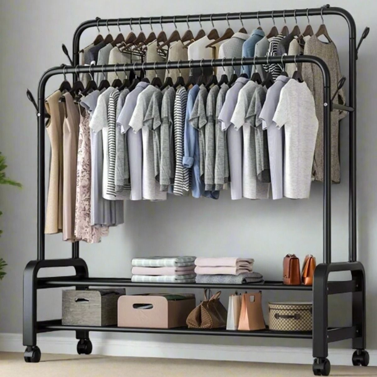 DREVONA Clothes Rack Heavy Duty Double Rail Garment Stand with Wheels - Black
