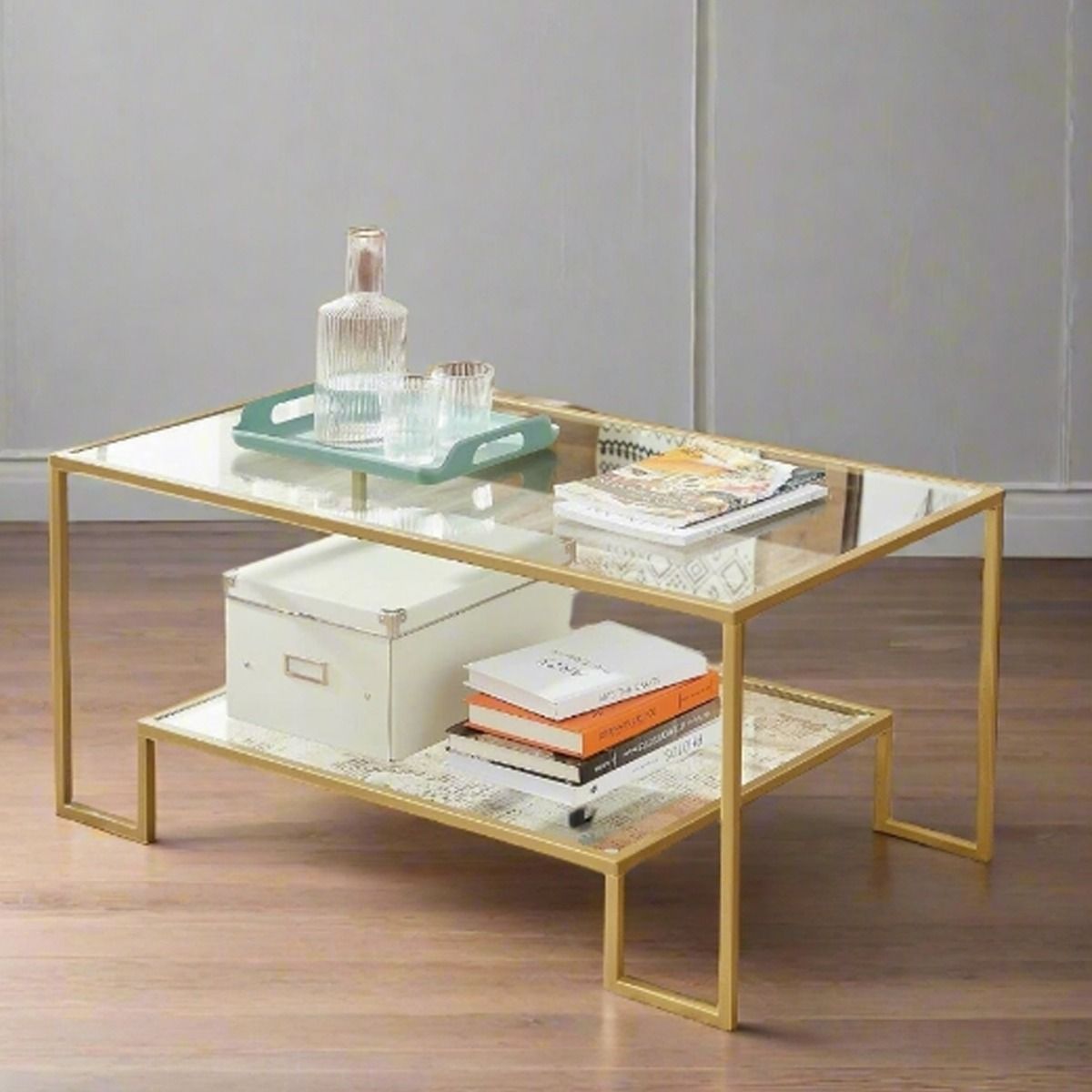 DREVONA Coffee Table Modern Glass Table with Storage and Gold Steel Frame - Gold
