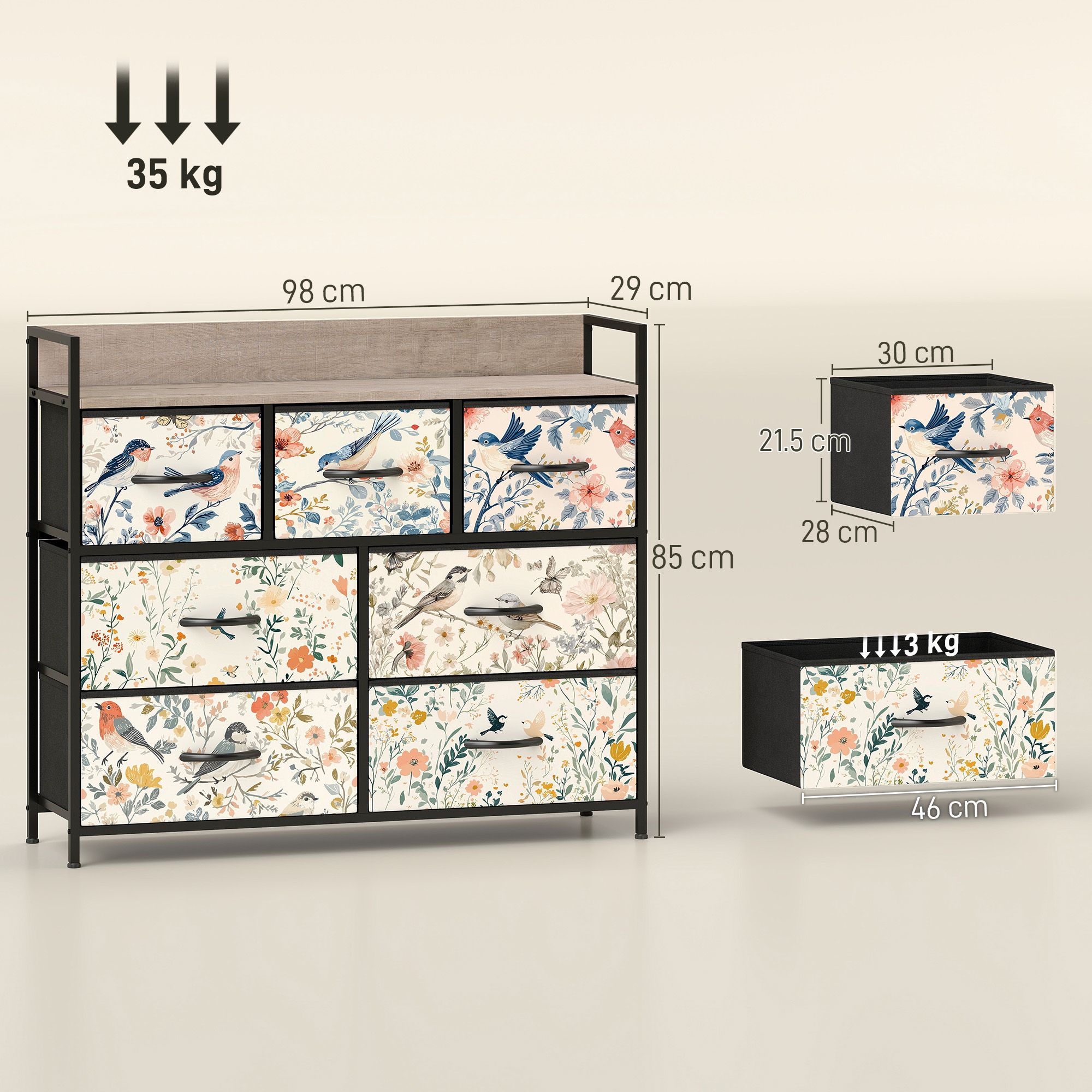 DWELVA Multi Colour Chest of Drawers - Medium-sized, 7 Drawers, Fabric Drawers - Bird Print