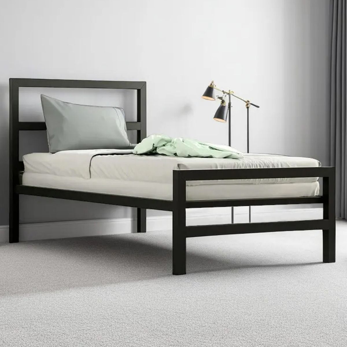 Finished in Textured Matt Black or Ivory. Simple geometry and reinforced side rails make this a very modern contract bed. This bed frame looks great in any modern bedroom setting. The mesh base has our exclusive base design which requires no centre support legs. The side rails are reinforced, and additional cross bars only add to the very strong appearance of the Eat bed frame. A superb value for money bed frame for all bedrooms. The 3ft single bed has one mesh piece (4ft & 4ft 6″ two), very quick & simple to assemble.