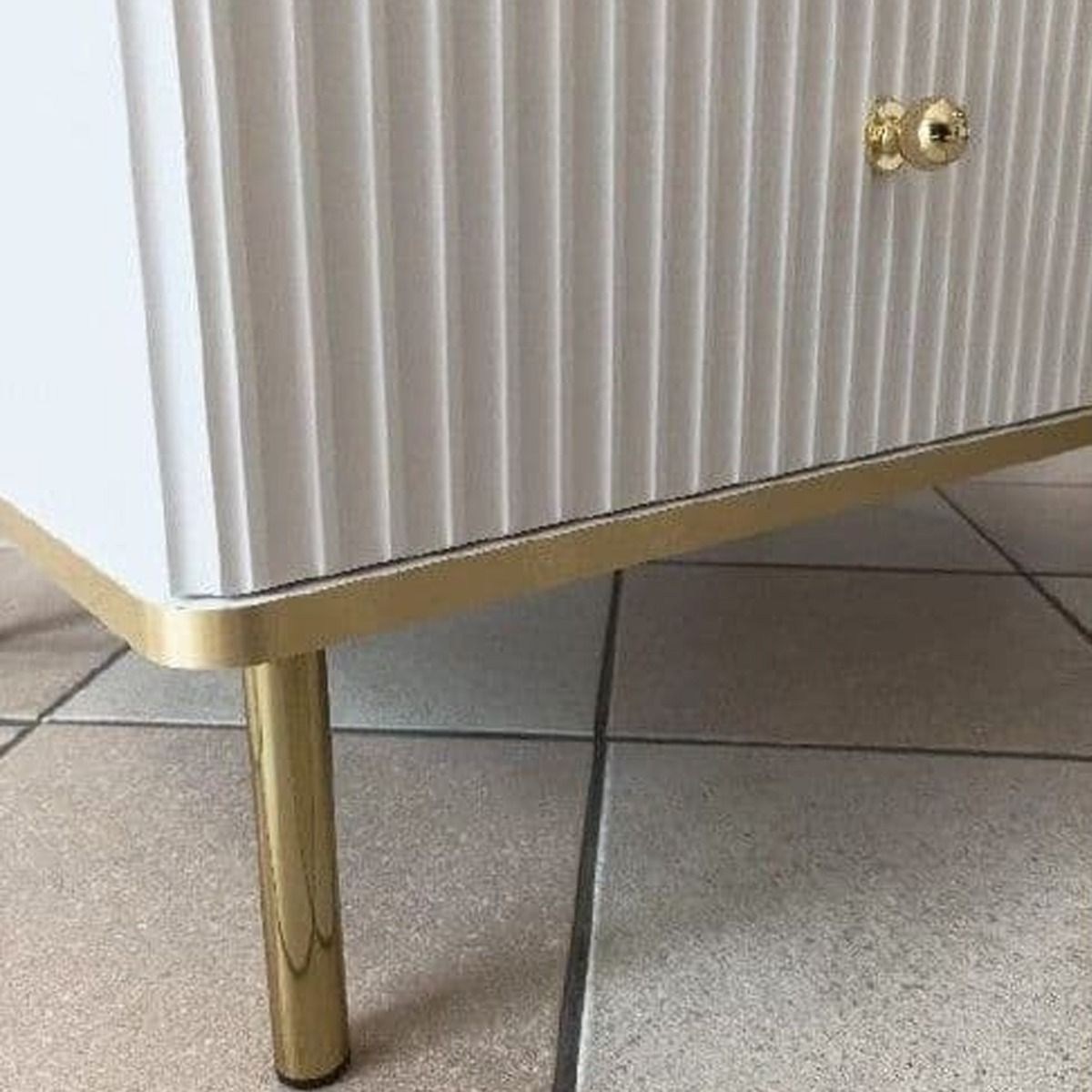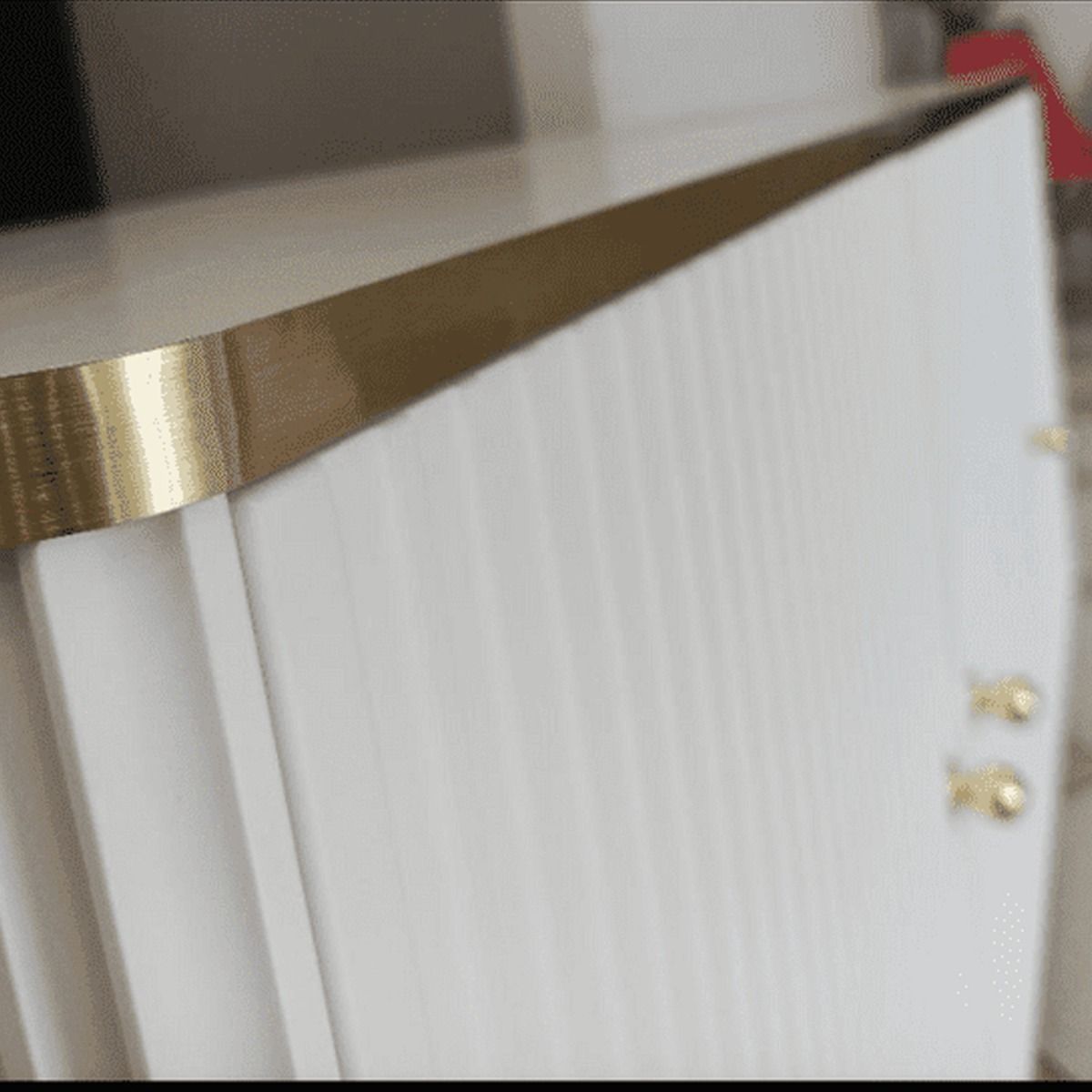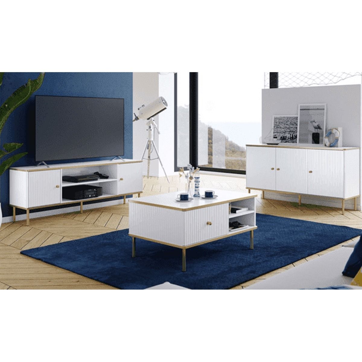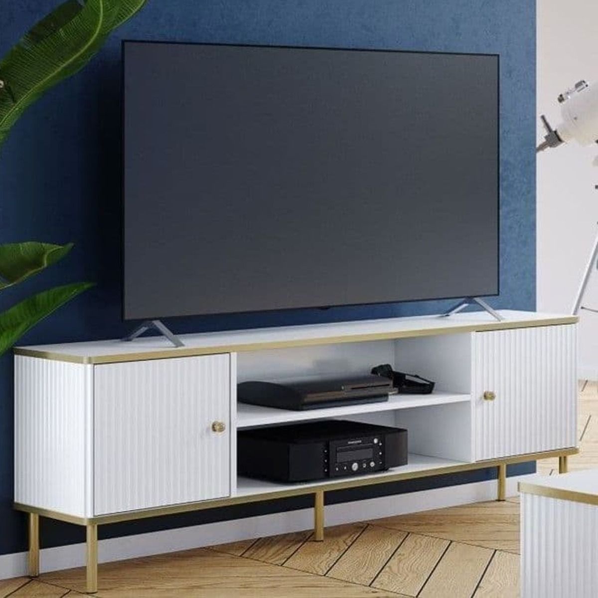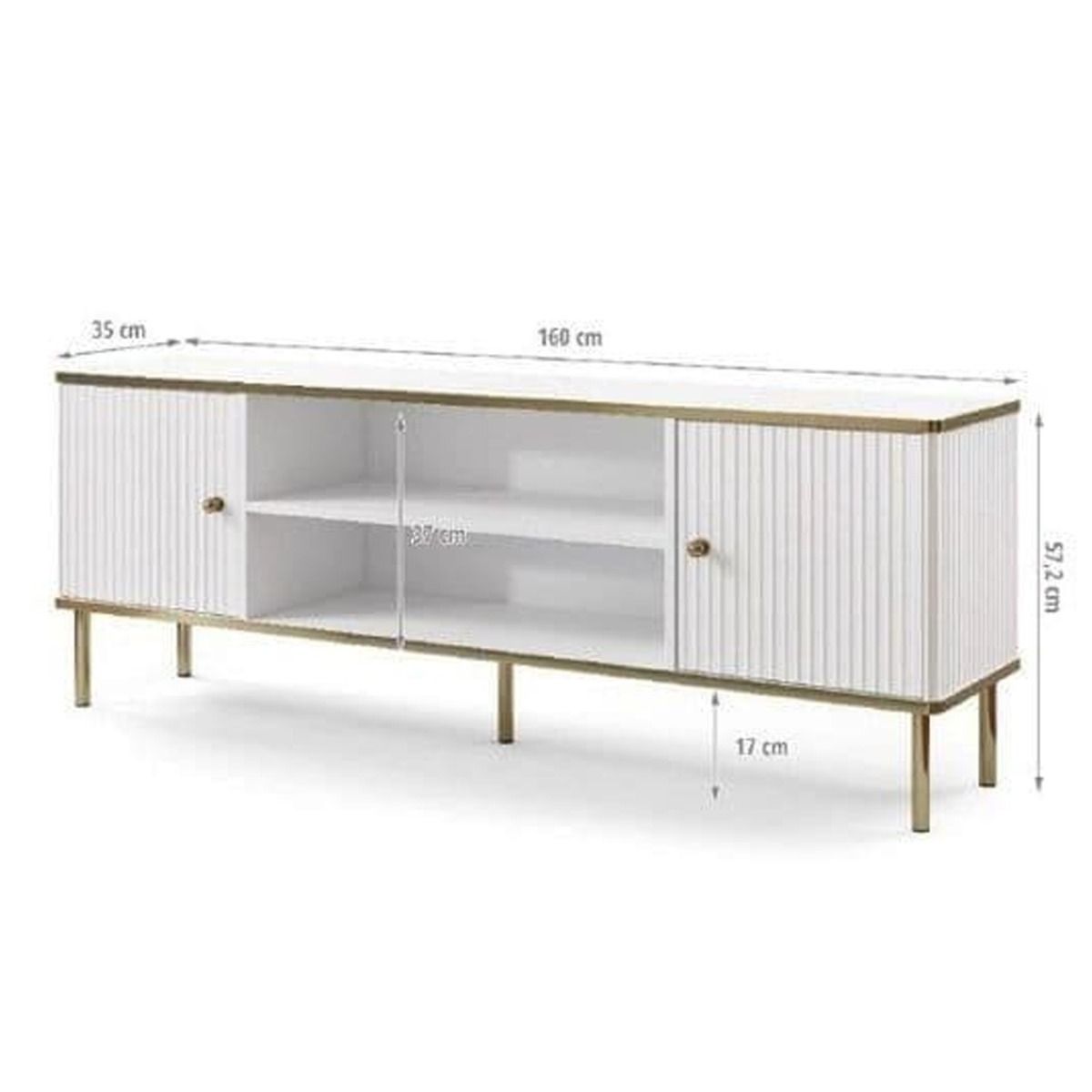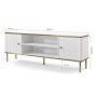 The Luxurious Eldawy TV unit in white with gold detailing. This TV cabinet features 2 doors and 1 open shelf.