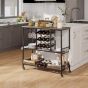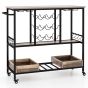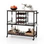 This 3-tier liquor cart is able to hold multiple glasses and bottles, ensuring your favorite wines are always within reach. With additional storage areas such as a spacious tabletop, 2 open compartments, 8 side hooks, and 2 bottom boxes, you have plenty of options to organize your essentials. It is easy to move this home serving cart with 4 universal casters, 2 of which can be locked for stability. Moreover, the versatile push handle also functions as a convenient towel rack. Supported by a heavy-duty metal frame, the beverage cart is sturdy. Furthermore, the rustic and elegant outlook adds a timeless charm to your home, whether in the kitchen, dining room, living room or more. Classified Storage Solution: Designed with glass racks and bottle holders, this rolling bar cart makes your favorite vintages always at hand.