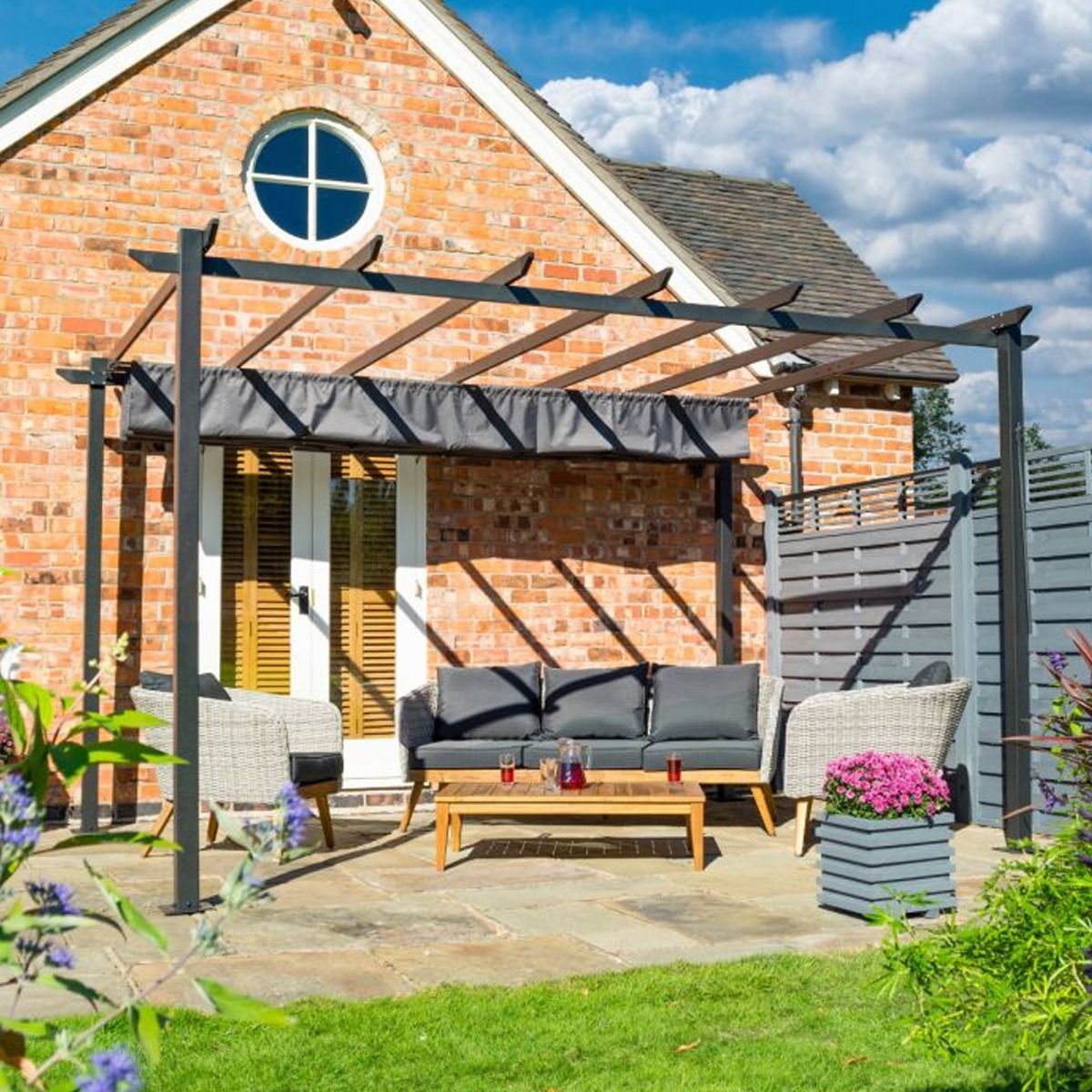 Constructed from durable aluminum with a gunmetal grey powder-coated frame, this canopy is built to last while adding a sleek, modern touch to your outdoor decor. The included detachable pulley tool offers convenient operation and can be stored away when not in use.