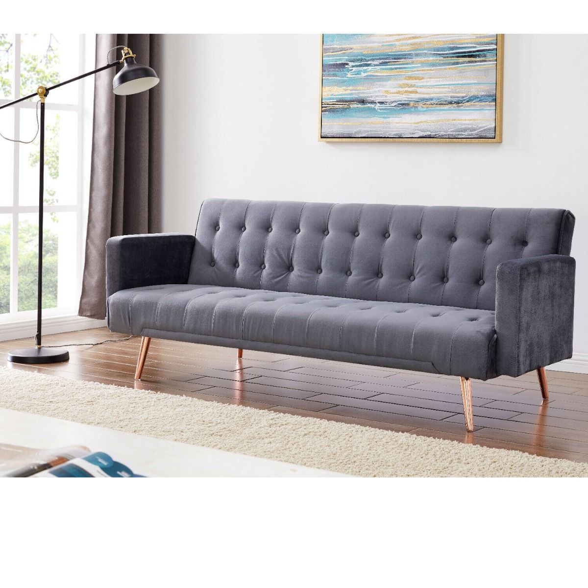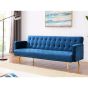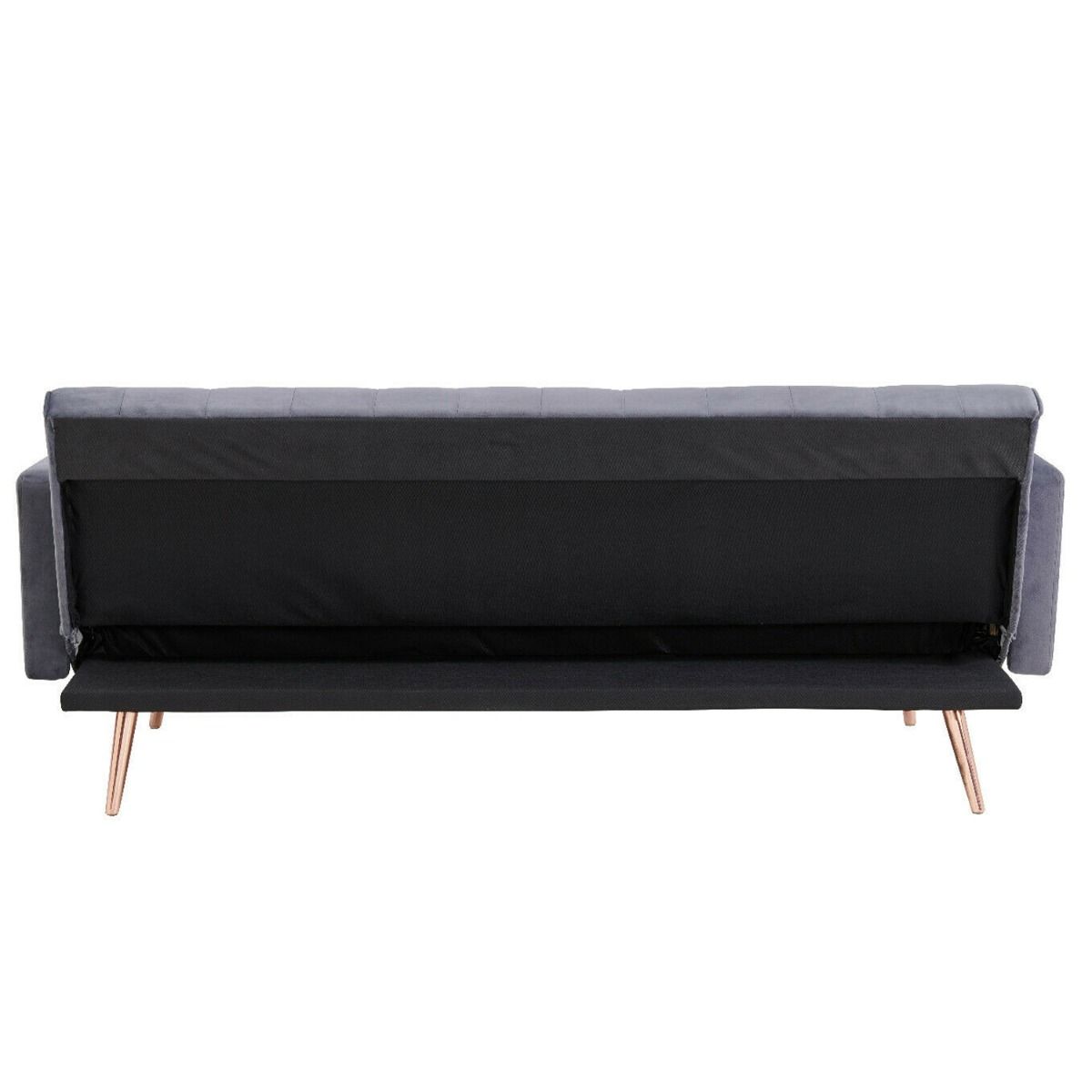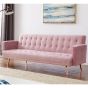 Our brand new Velvet fabric sofa bed is the perfect luxurious addition to any home. This sofa bed can seat up to 3 people and is available in a stunning range of velvet fabric options; Blue, Grey, Pink or Green. The sofa bed's simple yet elegant & stylish design comes with a cushioned foam filling for comfortability. The high armrests on either side provide a solid look. The real stand out feature is the stunning contrast rose gold or golden metal legs. The Grey and Pink velvet comes with Rose Gold legs, with the Blue or Green is contrasted with gold legs. The sofa bed uses a click-clac recline system with 3 positions; Upright, recliner & flat.