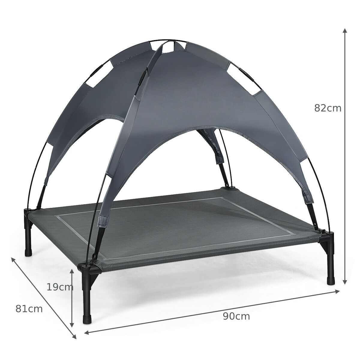 This elevated pet bed with a canopy offers your pets a place to lie and stay cool in the summer sun. The canopy effectively blocks UV rays providing your pet with a shady place to sit in the hot summer sun. It also offers protection from the rain. Suitable for outdoor use, the waterproof surface can be dismantled for easy cleaning and maintenance. This pet bed is the perfect gift for your beloved pets! Do not hesitate to buy it! High-quality Materials & Firm Structure: The pet bed is made from breathable Textilene mesh, which is very wear-resistant and scratch-resistant. With a strong metal frame and 4 anti-skid feet, the pet bed is stable and will hold a pet up to 50kg in weight. Elevated Design, Protect Pets' Health: This elevated bed is designed for better air circulation which will help pets stay cool and avoid insect bites. In addition, the elevated design keeps pets off the hard, wet ground, providing them with a comfortable place to lie while effectively protecting their joints. Sunscreen & Waterproof Canopy: The detachable sunscreen canopy provides your pet with sufficient shade to keep cool in hot summer. Effectively blocking ultraviolet rays or rain, which makes this suitable to be used outdoors. Perfect Gift for Pets: Our pet bed offers a place for your pets to relax and enjoy the outdoors in style. Lightweight in design making it easy to transport, ideal for camping, in the garden, or on the beach. In addition, the sun canopy can be quickly removed, offering a sturdy indoor bed. Easy to Install & Clean: Easy to assemble without the need for tools, the canopy easily connects over the bed and secured with elastic ropes. Easy to dismantle and clean with a damp cloth