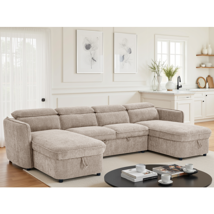 ELVAREN Fabric 4 Seater U Shaped Corner Sofabed - Beige