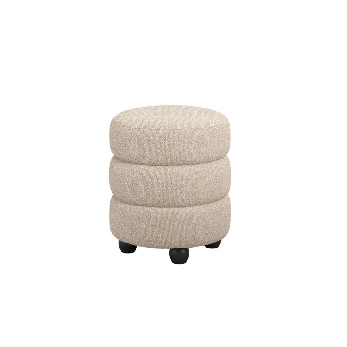 Upholstered in buff boucle fabric, this versatile pouffe features curved lines and round black pine feet. Comfortable and multi-use, it’s perfect as a footrest, extra seating, or a stylish accent piece.