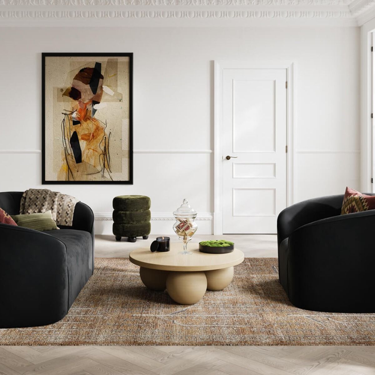 The ENA Pouffe in luxurious Olive Chenille Velvet features curved lines and round black pine feet for a modern touch. Comfortable and versatile, it’s perfect for multi-use in any space.