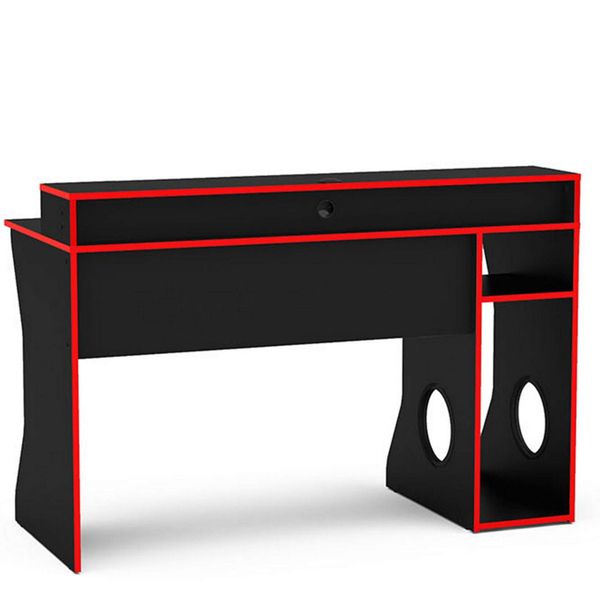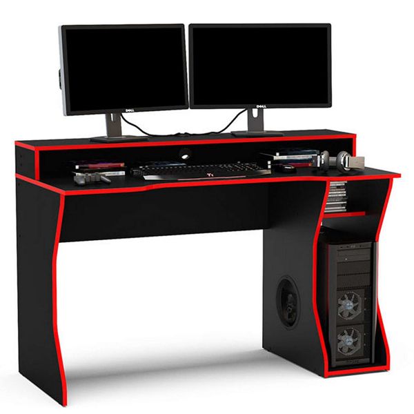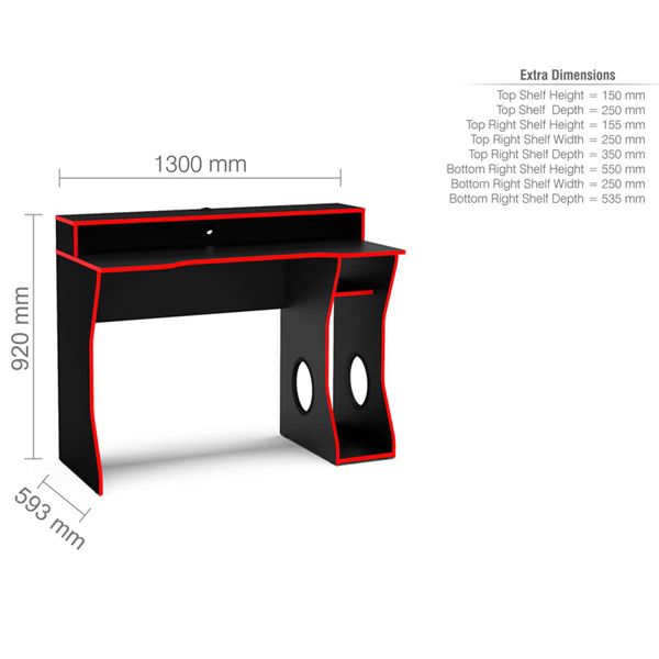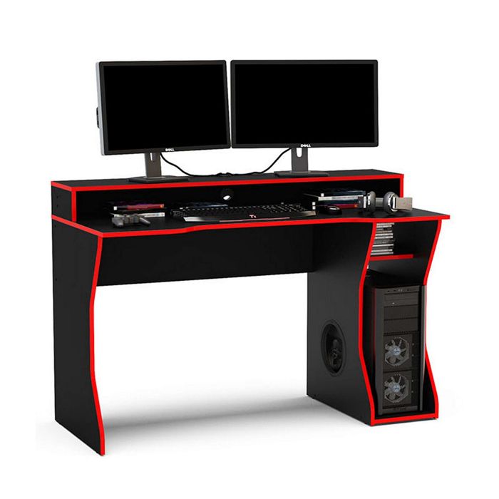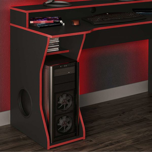 The Enzo gaming computer desk has been made with gamers fully in mind! It has everything a busy gamer could need. Featuring a large top shelf big enough for two large monitors and a generously sized ergonomic desk below suitable for the keyboard, mouse, controllers, games and more. The base of the desk features a computer store away with a ventilation hole and small shelf for games or controllers. This modern looking gaming computer desk is finished in black with a dark red trim making it a stunning addition to any home or office. Care instructions: Wipe carefully with a soft, dry cloth.