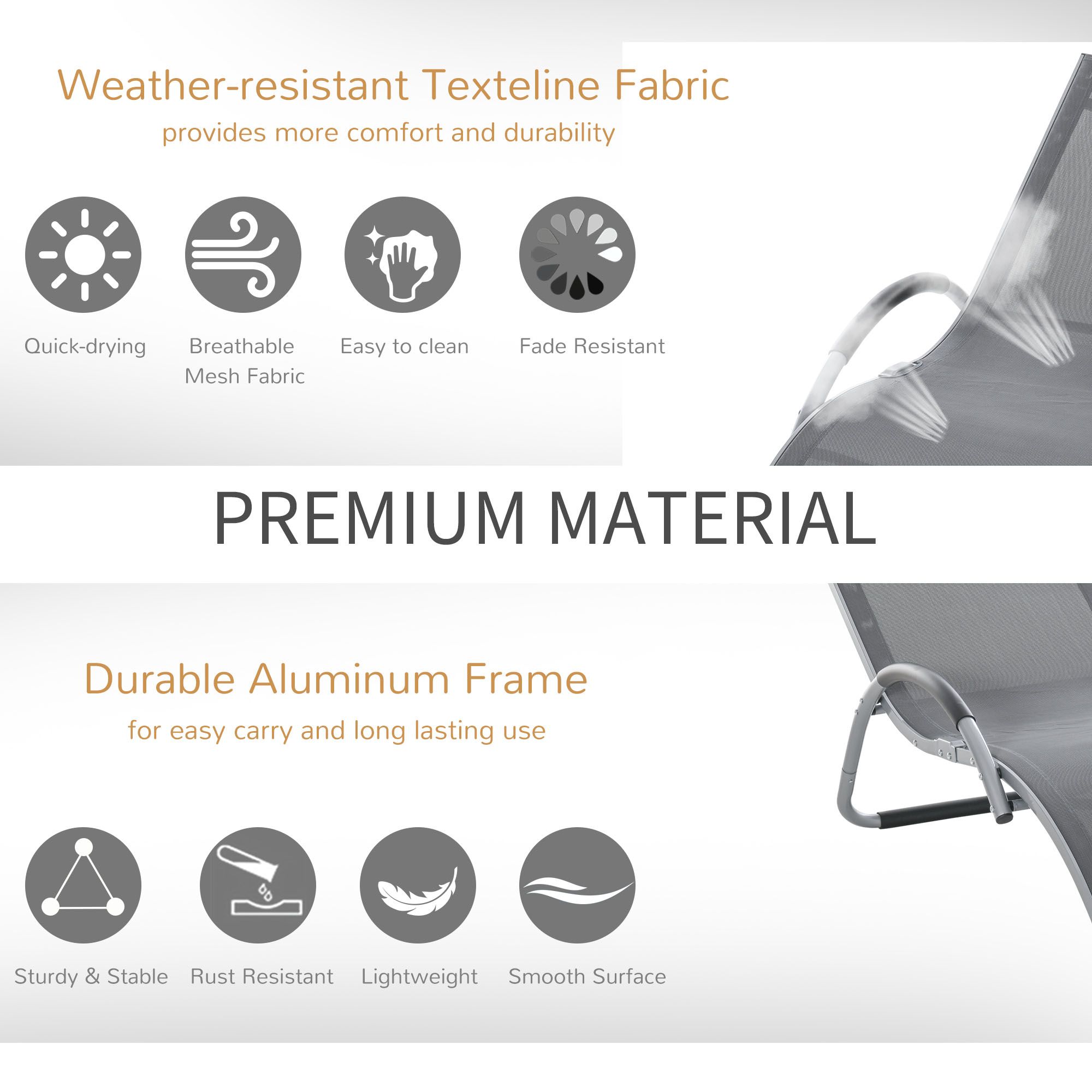 - Curved frameworks with your body's shape for support, made from powder-coated aluminium for strength