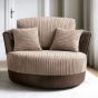 A lounge swivel chair that might just make others in the home envious! Enjoy high back cushions that can shelter even the broadest of shoulders, while offering ample arm rests as well. Deep-filled foam cushions are upholstered in a durable but exquisitely soft structured cord chenille and faux suede leather fabric. Enjoy a brilliantly comfortable chair that swivels with little effort. Colour options are a warm black and grey colour combination and also a more vibrant brown and beige colour combin