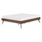 A minimalist focal point for any modern bedroom. This bed frame, constructed from MDF, boasts a natural look thanks to the exposed wooden finish, which beautifully highlights Scandinavian and rustic decor styles. Its plain and simplistic appeal makes the bed exceptionally easy to accessorise. Designed without a headboard, it is the perfect solution for rooms with low or slanted ceilings, and attics. Details: Color: Dark Wood. Main material: MDF. Additional material: Rubberwood. Weight: 33 Assembly: Full Assembly Required Wood type: Hevea brasiliensis Wood Origin: Malaysia Weight Capacity: 270 Legs Height: 23 Sleeping Surface: 140x200