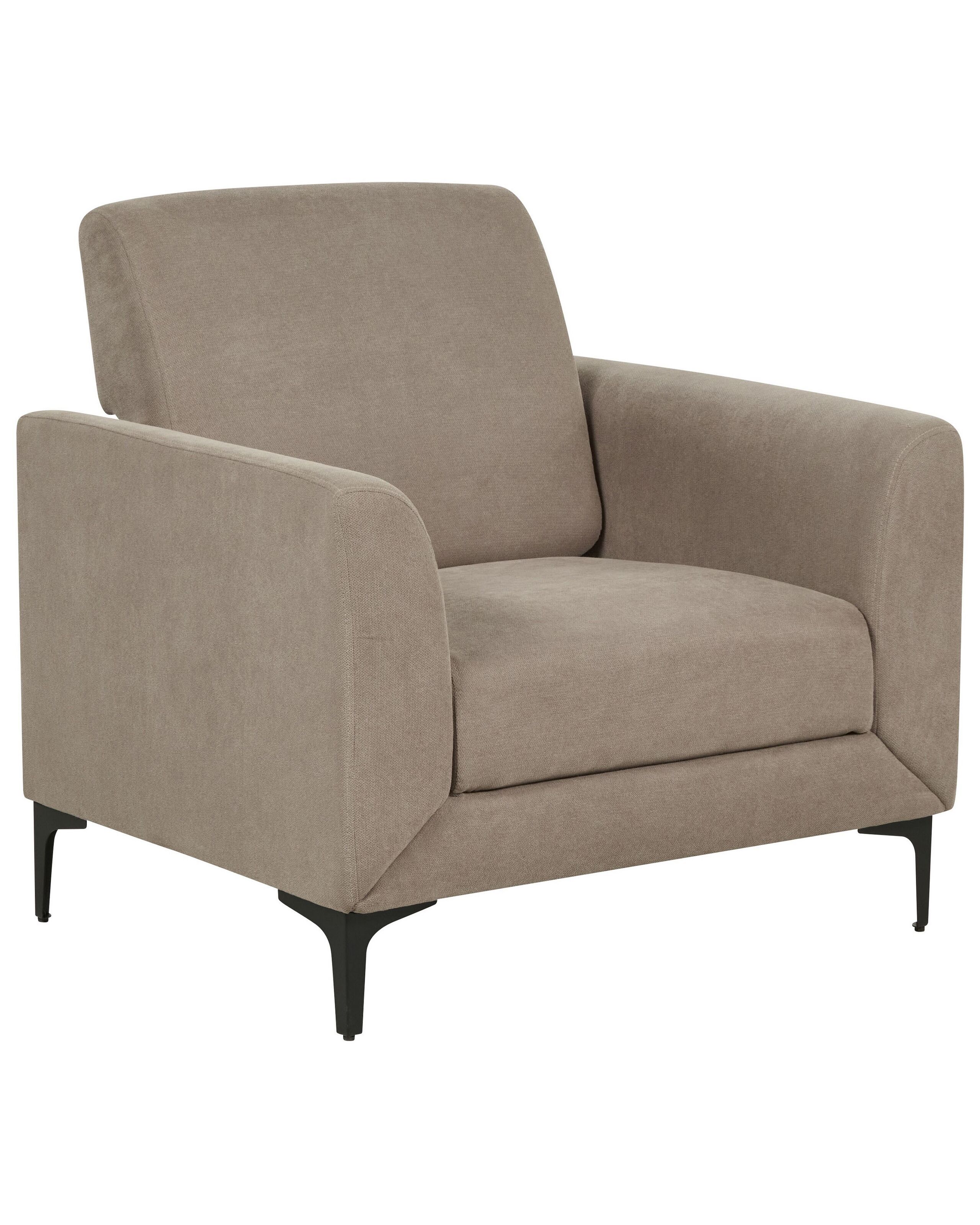 This comfortable, exceptionally stylish chair offers a timeless, classic look paired with a soft, fabric upholstery and metal legs. Perfect for any room - from a retro-inspired interior to a contemporary loft - it instantly creates a favourite relaxation or reading spot and gives every living area a warm, inviting feel, thanks to its deep seats, thick cushions, and wide armrests. Details: Color: Beige, Black. Main material: Polyester. Additional material: Metal, Polyester. Material Composition: 100% Polyester Weight: 26 Assembly: Legs to be Fitted Weight Capacity: 180 Padding Thickness: 34 Seat Height: 50