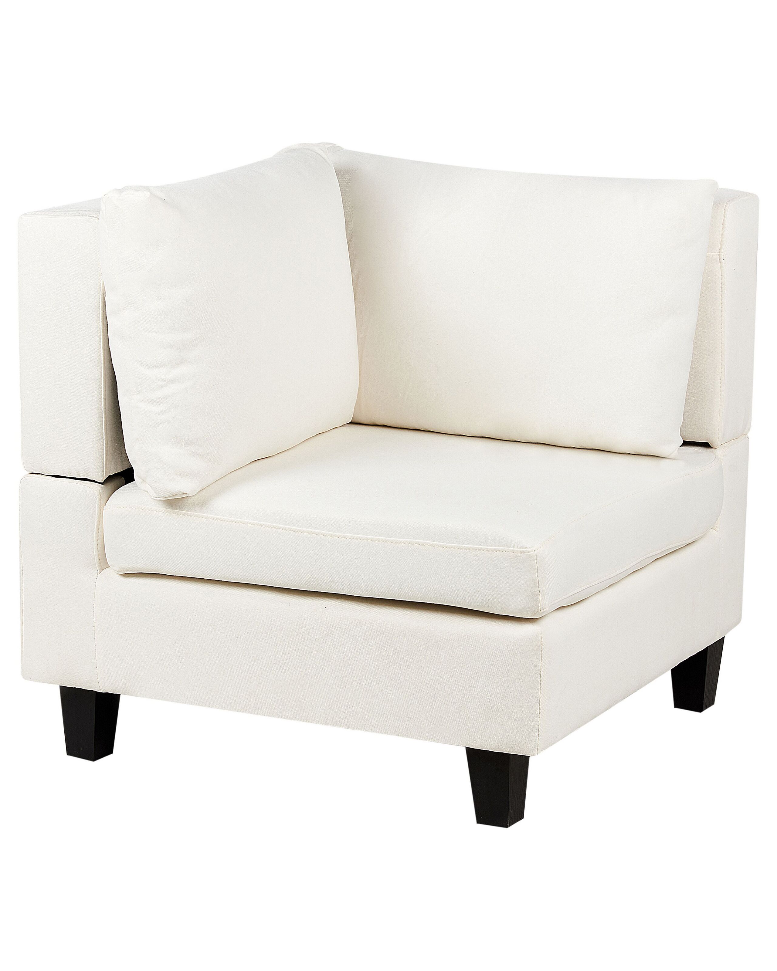 This corner module is going to be a great, multifunctional addition to your living space. You can either use it together with other elements to create a sofa straight out of your dreams, or use it as a standalone, extra seating space. Crafted out of pleasant to touch polyester fabric, the piece is quite durable. The thickly padded seat offers great comfort when sitting, which is additionally elevated by a cushioned backrest. The whole construction is also stable due to wide legs in black colour. Details: Color: White, Black. Main material: Polyester. Additional material: Eucalyptus Wood, Plywood, Synthetic Material, Polyester. Material Composition: 100% Polyester Weight: 22 Capacity: 1 Person Assembly: Partial Assembly Required Wood type: Eucalyptus grandis Wood Origin: China Cushions Dimensions: 41x64/53 Legs Height: 12 Padding Thickness: 10 Seat Height: 39