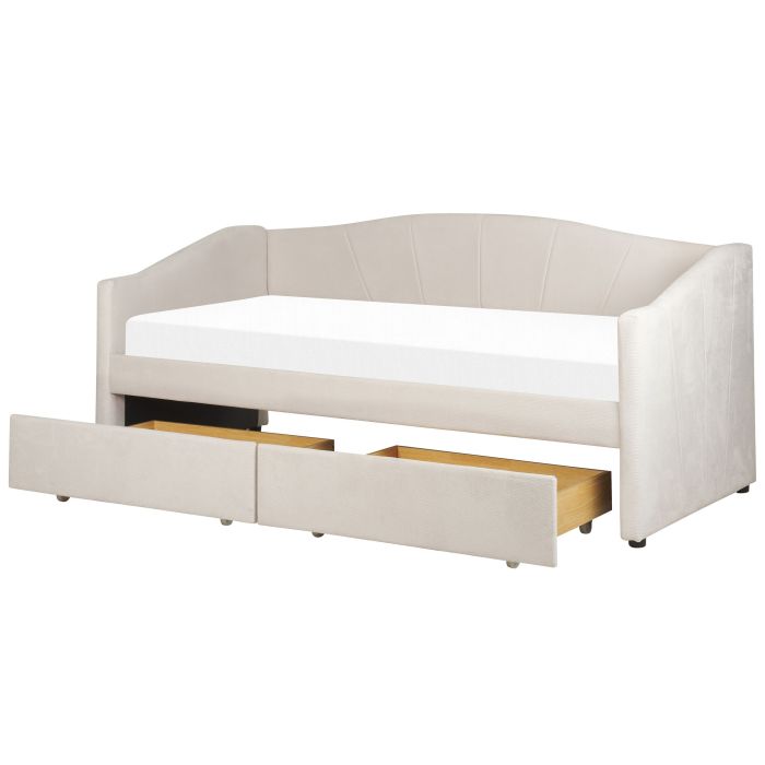 Discover timeless elegance with this daybed in a classic design, a hallmark of both comfort and sophistication. Crafted with precision, its sturdy wooden construction ensures long-lasting durability and stability. The bed features two drawers, offering ample storage space and organization. Upholstered in high-quality polyester fabric, it exudes an aura of refinement and is easy to maintain. The incorporated slatted frame guarantees excellent support, promoting a restful and rejuvenating sleep experience. It will seamlessly complement bedrooms of various styles, making it a versatile addition to any interior aesthetic. Details: Color: Beige. Main material: Polyester. Additional material: Synthetic Material, Eucalyptus Wood, Plywood. Material Composition: 100% Polyester Weight: 50 Assembly: Full Assembly Required Wood type: Eucalyptus grandis Wood Origin: China Weight Capacity: 160 Legs Height: 2 Sleeping Surface: 90x200