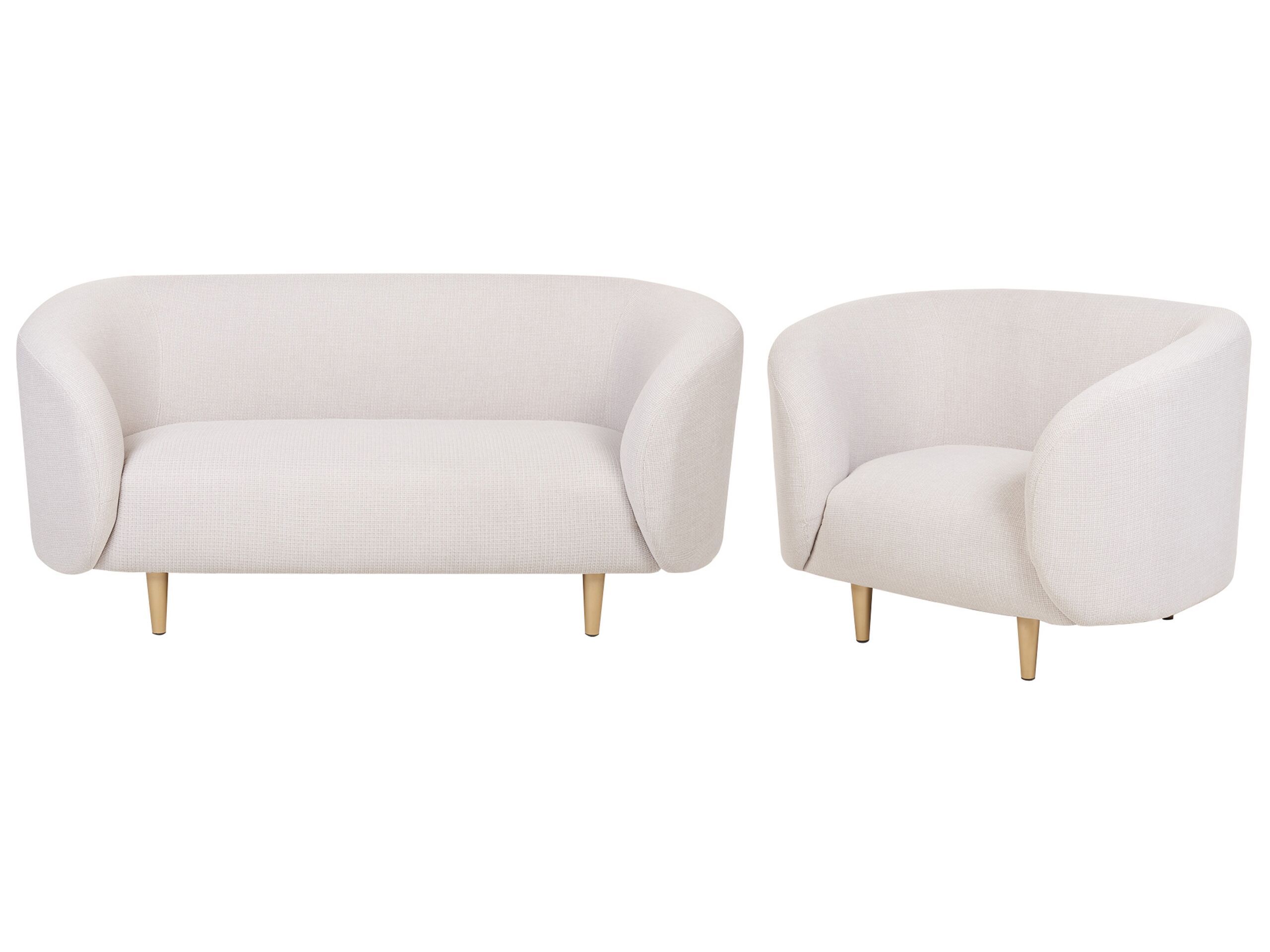 This beautiful living room set exudes a luxury feel, from its gold legs to the soft curves of the upholstered silhouette. Tailored in polyester fabric, it looks and feels pleasantly soft, adding an inviting look to the space. The thickly padded seat offers comfortable seating, making it the perfect spot for reading or enjoying some late-night TV. The opulent design of the sofa and armchair will perfectly complement interiors in eclectic, traditional or mid-century style. Details: Color: Beige, Gold. Main material: Polyester. Additional material: Iron, Eucalyptus Wood. Material Composition: 100% Polyester Weight: 78 Capacity: 3 People Assembly: Legs to be Fitted Wood type: Eucalyptus grandis Wood Origin: China Overall Dimensions: 155x70x79 Legs Height: 19 Padding Thickness: 27 2 Seater Sofa Dimensions: 155x70x79 Seat Height: 40 Armchair Dimensions: 105x70x79