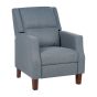 Change your living room into a pure relaxation spot thanks to this functional recliner armchair. The classic design of the chair inspired by retro forms in universal blue tones will fit into any traditional or vintage-styled interiors. The upholstery is made of durable, high-quality fabric, which is easy in maintenance. Elegant-looking legs made from rubberwood won't scratch your floors due to the added pads. The inbuilt recliner mechanism allows you to choose one of two available positions, so you can wind down after a long day and enjoy your favourite film or series. Details: Color: Blue, Dark Wood. Main material: Polyester. Additional material: Rubberwood, Eucalyptus Wood, Plywood. Material Composition: 100% Polyester Weight: 31 Assembly: Full Assembly Required Wood type: Hevea brasiliensis, Eucalyptus grandis Wood Origin: China Weight Capacity: 115 Padding Thickness: 16 Seat Height: 49