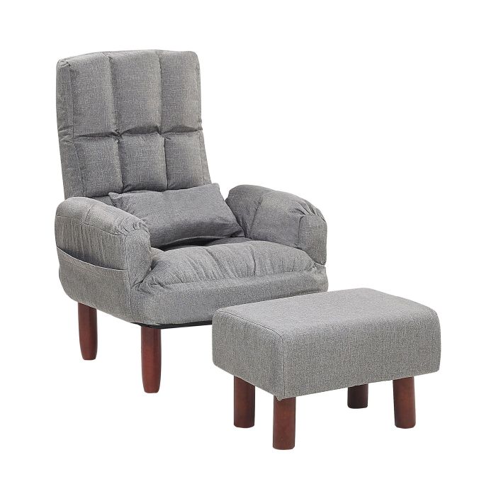 This armchair truly embodies the perfect combination of style and comfort. The seat, backrest and armrests are all generously padded while the durable upholstery adds a retro touch. The chair can be easily adjusted to recline into five different positions. The pockets positioned on both sides of the arms mean the TV remote or your favourite book and magazine are always at hand. The set is completed with a matching footrest with plenty of space for weary feet. Details: Color: Grey, Brown. Main material: Polyester. Additional material: Beechwood. Material Composition: 100% Polyester Weight: 15 Assembly: Legs to be Fitted Wood type: Fagus Sylvatica Weight Capacity: 150 Overall Dimensions: 65x110x92 Cushions Dimensions: 38x22 Padding Thickness: 17 Ottoman Dimensions: 50x38x38 Seat Height: 37