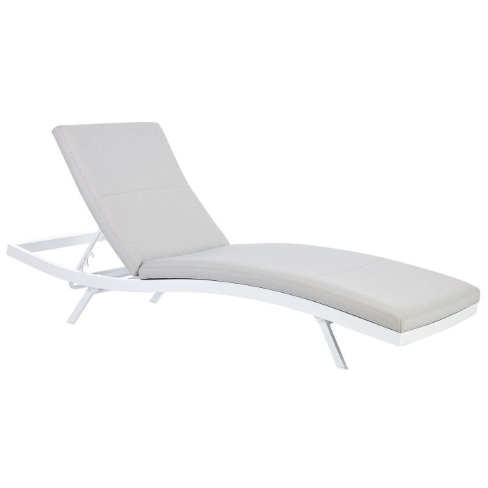 This modern reclining sun lounger upgrades your patio, making your outdoor space perfect for sunbathing and relaxing. Whether you want to read a book or lie down, you can adjust the backrest to suit your needs. Thanks to the curved shape and thickly padded cushion, featuring Quick Dry foam filling, it is very comfortable. Durable aluminium construction provides quality for years to come and makes the sun lounger stable. Details: Color: Grey, White. Main material: Aluminium. Additional material: Textile Fibres. Material Composition: 100% Olefin Weight: 15 Assembly: Does Not Require Assembly Weight Capacity: 130 Legs Height: 25 Seat Height: 36