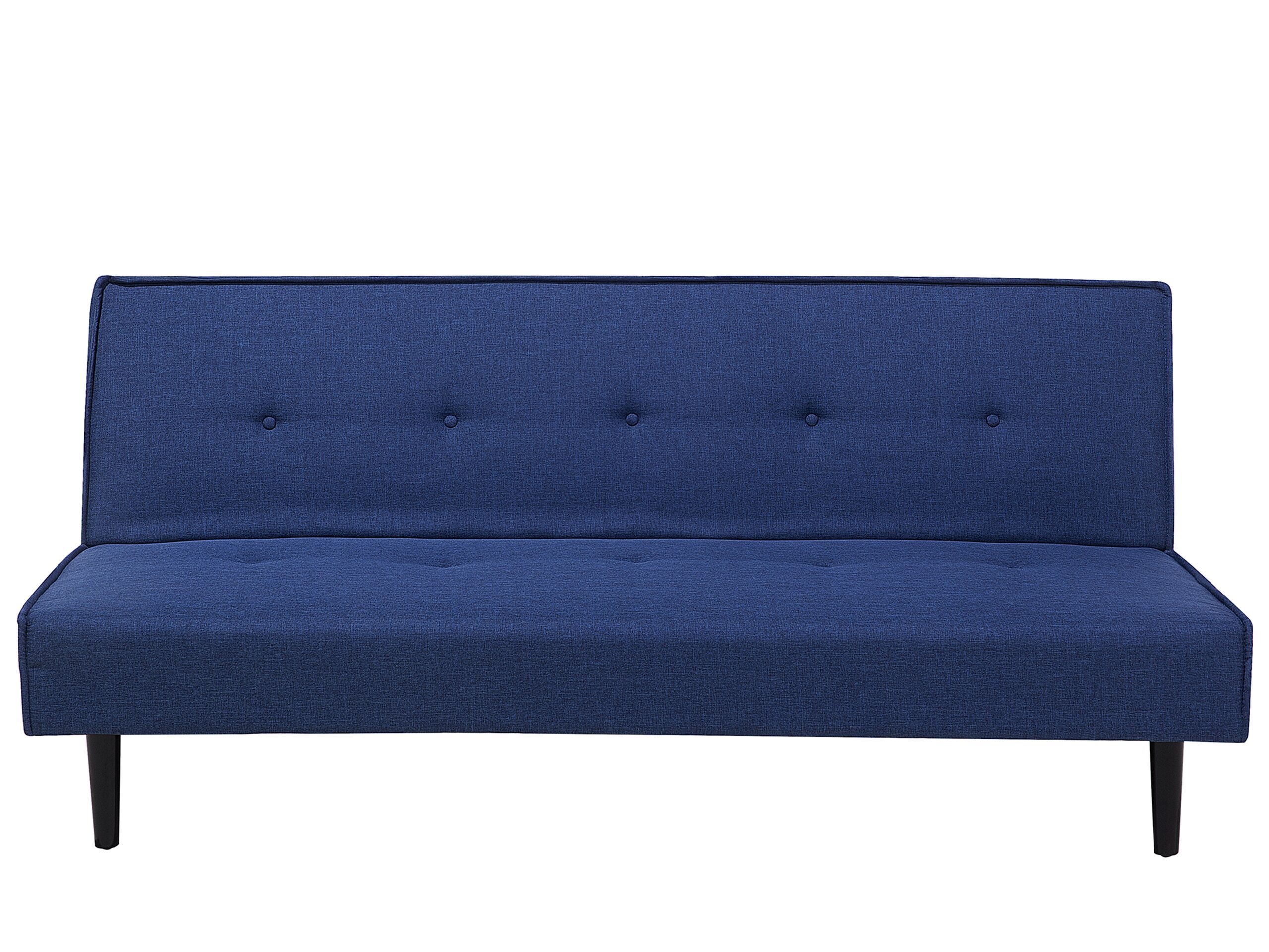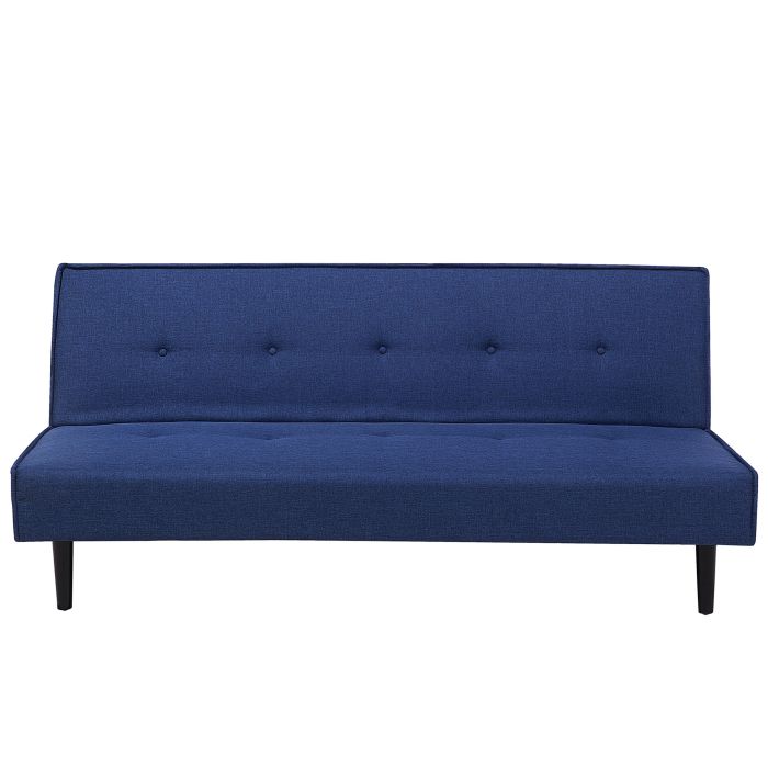 Cosy and comfortable sofa in a straightforward yet multifunctional design that works great in any modern living area. Constructed with armless sides, it offers plenty of space for sitting and sleeping. The pleasantly padded and covered in hard-wearing polyester fabric seat features rubber wood legs and button-tufting on the backrest that underline the uncomplicated look. This blue 3-seater goes well with lofts and urban interiors in an industrial or retro style. Details: Color: Blue, Black. Main material: Polyester. Additional material: Rubberwood, Eucalyptus Wood. Material Composition: 100% Polyester Weight: 31 Capacity: 3 People Assembly: Partial Assembly Required Wood type: Hevea brasiliensis, Eucalyptus grandis Wood Origin: China Legs Height: 20 Seat Height: 37 Sleeping Surface: 180x110