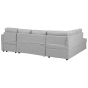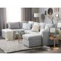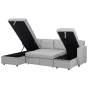 Anchor the design of a large interior with this inviting, versatile sofa bed. This generous, modern, U-shaped sofa allows five people to comfortable lounge. Two chaise lounges boast hidden storage space and the middle piece is designed with a pull-out mechanism to transform the sofa into a bed if needed. Fully upholstered in high-quality polyester fabric in modern light grey and featuring synthetic legs with protective caps, the sofa comes complete with a set of pillows with removable cases. Details: Color: Grey. Main material: Polyester. Additional material: Synthetic Material, Eucalyptus Wood. Material Composition: 100% Polyester Weight: 153 Capacity: 4 People Assembly: Partial Assembly Required Legs Height: 5 Padding Thickness: 17 Seat Height: 51 Sleeping Surface: 133x263