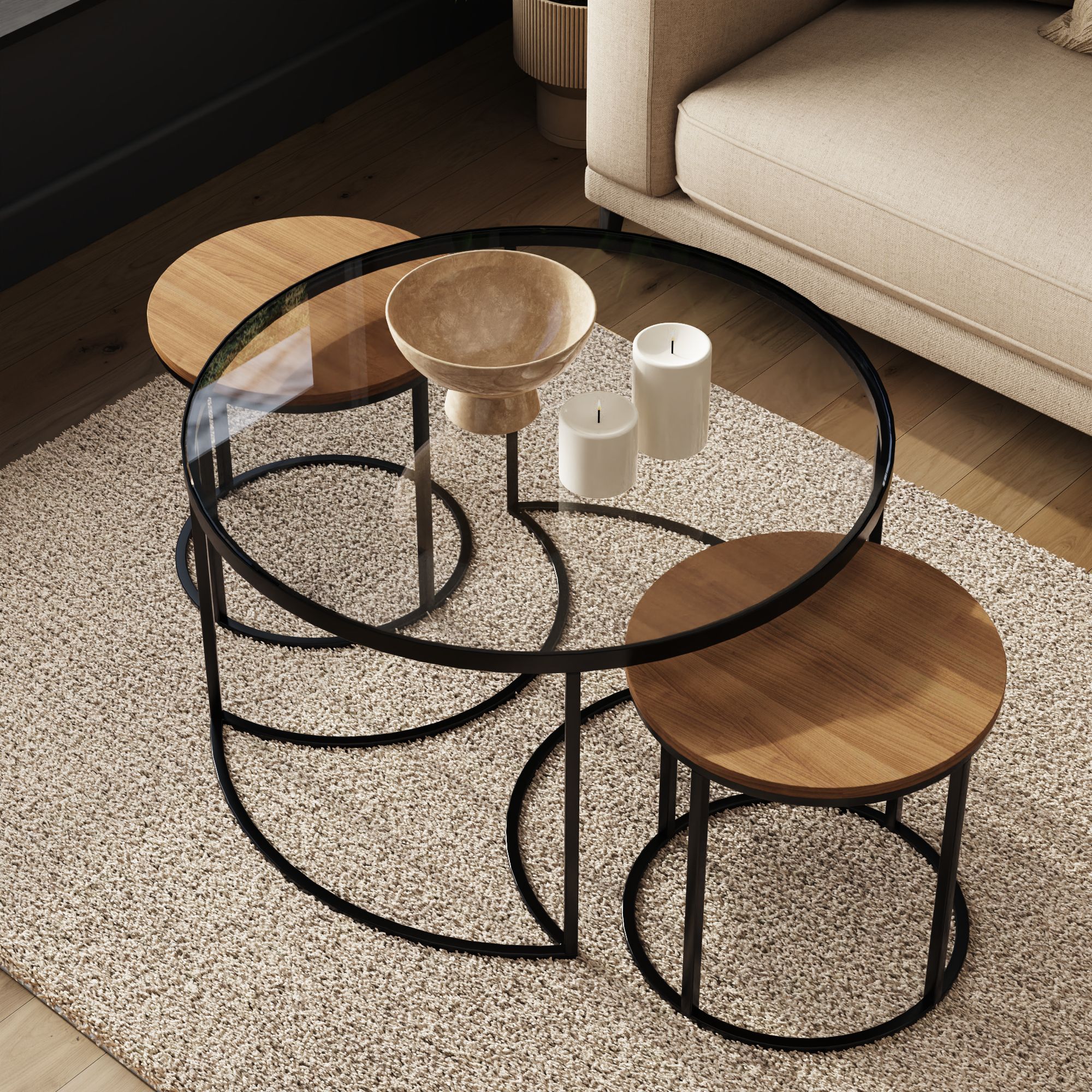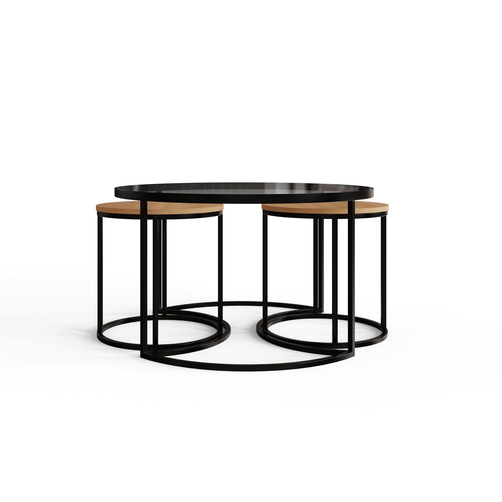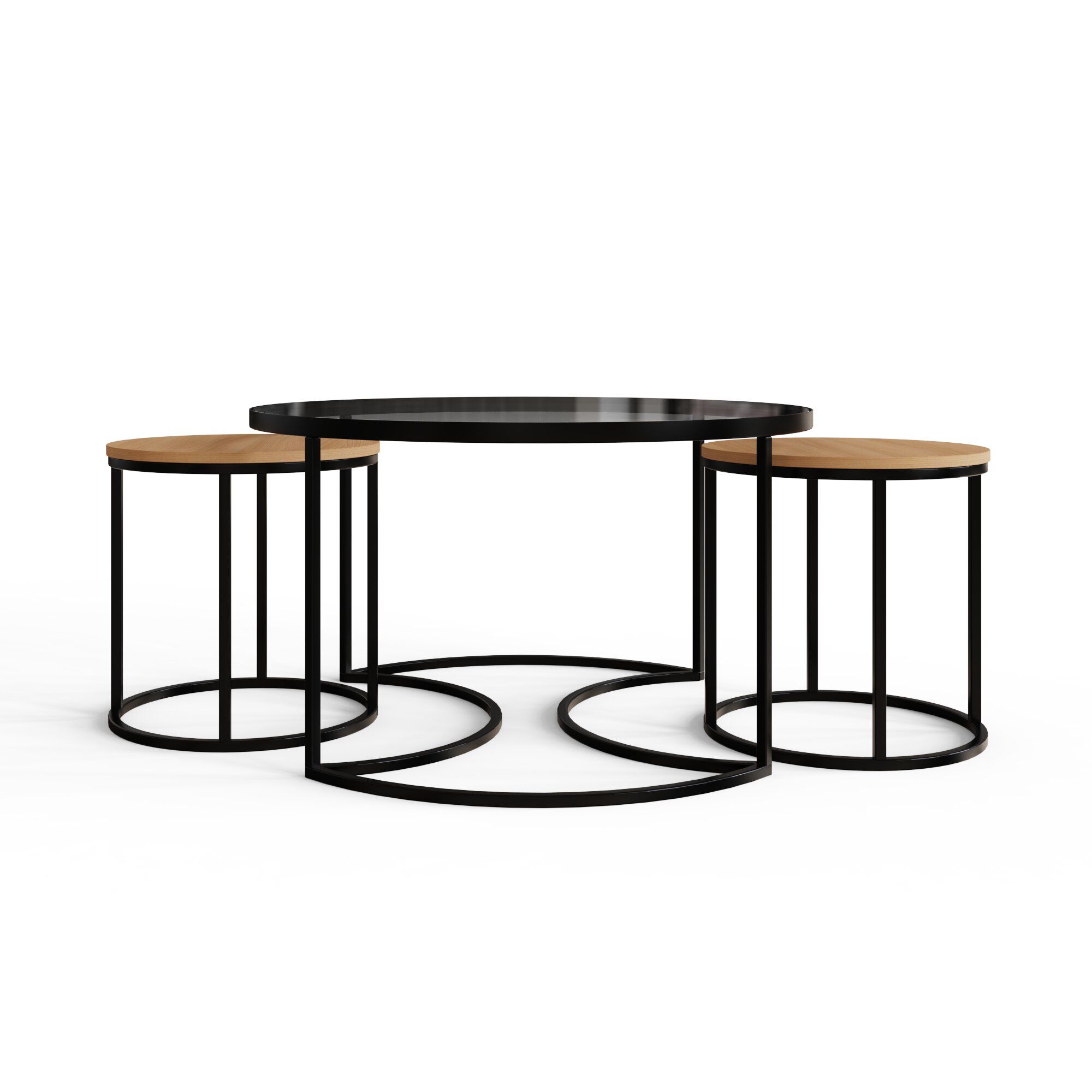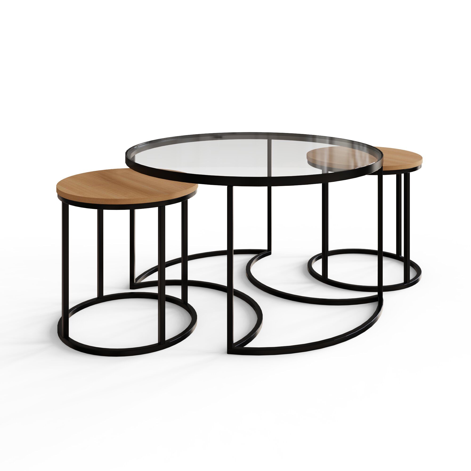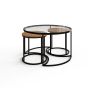 The FARIS Nesting Tables bring modern elegance and function to your living space. Featuring a sleek glass top, black metal frame, and warm wood accents, this versatile trio blends style with practicality. The smaller tables nest neatly under the main one, perfect for saving space or creating flexible surfaces when entertaining. Simple, timeless, and effortlessly refined, FARIS fits beautifully into any home decor.
