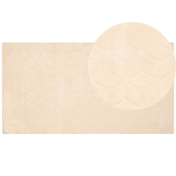 Gorgeous rug, created to bring extra warmth and a flair of elegance to any room. Made from polyester but perfectly imitating rabbit fur, it offers immensely soft, dense and high pile that you’ll gladly sink your feet into. The embedded geometric pattern looks really elegant, while the solid colour of the rug makes it easy to fit within any home décor. Use it to add visual texture and make your space feel cosy. Details: Color: Beige. Main material: Polyester. Material Composition: 100% Polyester Weight: 2 Assembly: Does Not Require Assembly