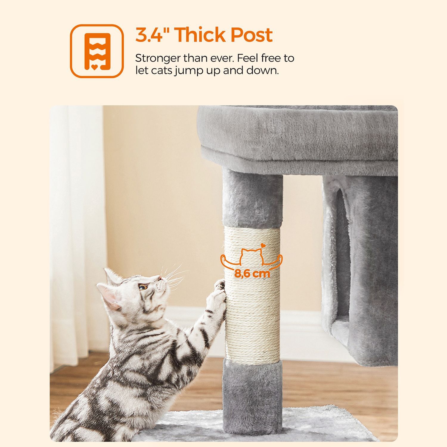 FEANDREA cat trees have all the characteristics you need to make your cats flourish.LOUNGING - Enlarged top perch with raised edge offers luxurious lounging experience;SCRATCHING - Strong posts covered by natural sisal rope allow cats to scratch and stretch;NAPPING - Thanks to the dual condo design, your cats can finally have their own beds and make peace with each other.Other than all those fun, your pets' safety will also be taken care of. The bottom is strengthened with battens to enhance stability; anti-toppling fittings are also included so you can secure it to the wall. Whether you have kittens, large cats or aged cats, this cat tree is a wonderful home for your furry pals.