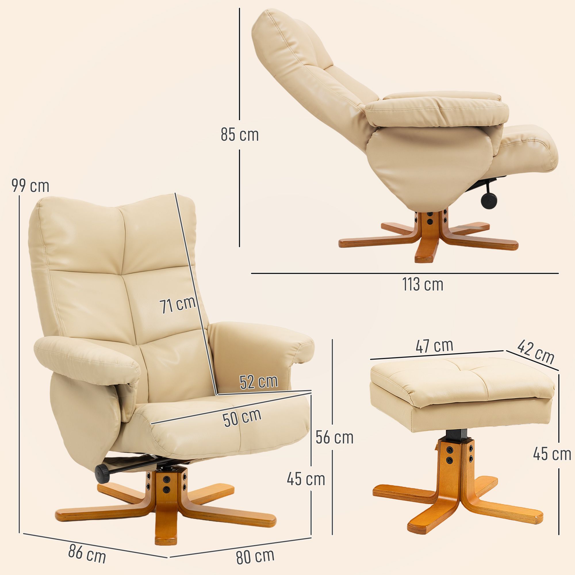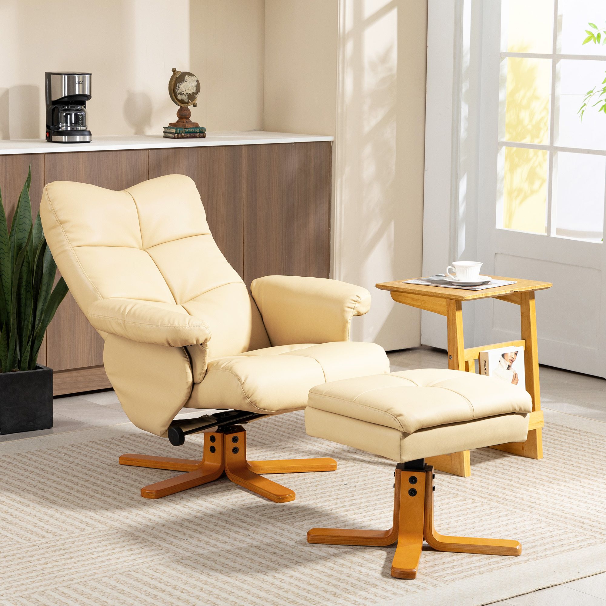 FERON PU Leather Recliner Swivel Chair with Footstool - Beige