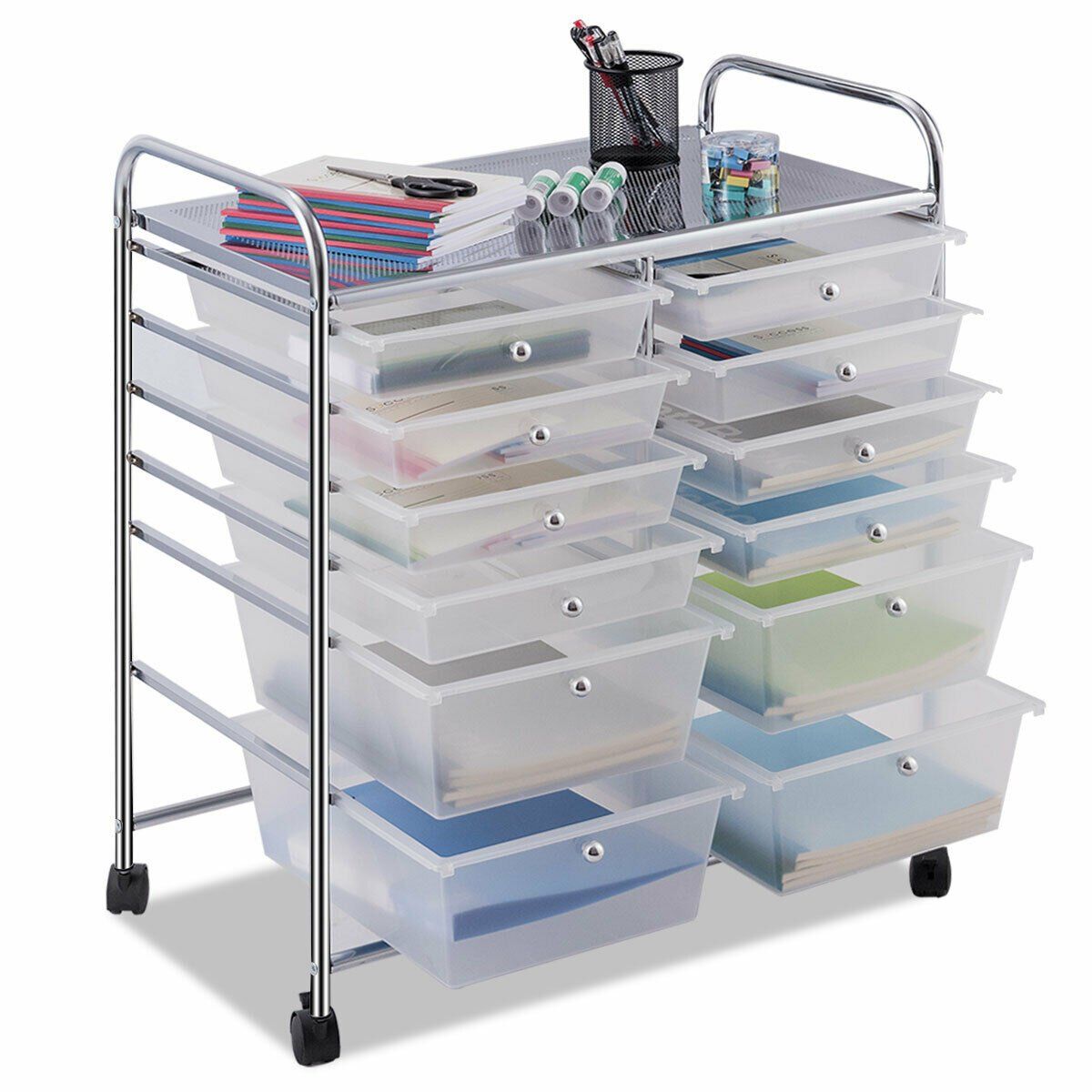 File Cabinet - 12 Drawers Rolling Storage Cart with 4 Wheels and Brakes-Clear