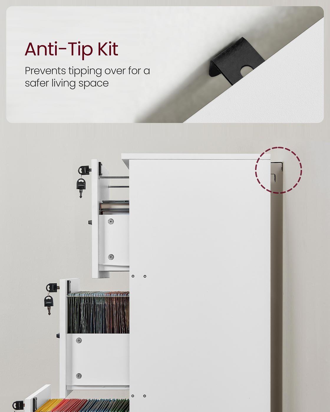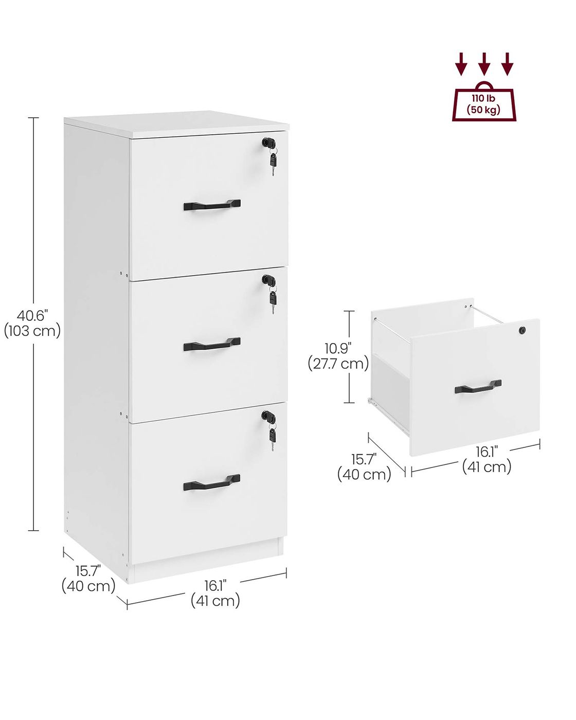 Organize your workspace with this stylish VASAGLE 3-drawer file cabinet in Cloud White. Perfect for home offices, it functions as a filing cabinet and printer stand. Key features include a lockable design for security and an adjustable hanging rail to accommodate A4 files. Keep your documents and office essentials tidy and accessible.