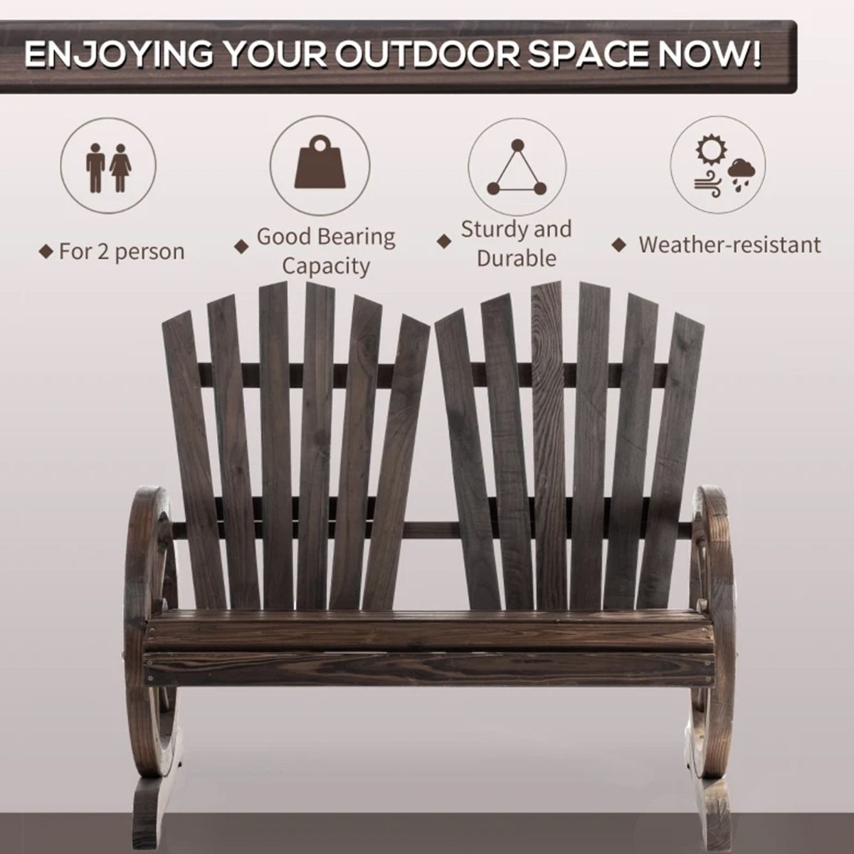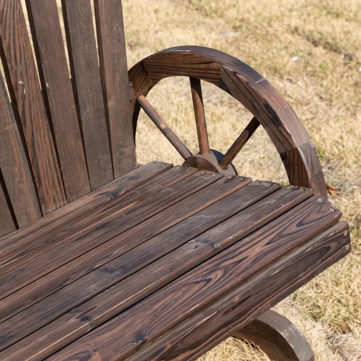 Constructed from natural fir logs, this wooden love chair has well-designed wheel-shaped armrests, which is quite unique and elegant. It can be places in any relaxation area, like garden, yard, patio, pool side, etc. The wide seats and sturdy design can provide rest for at least two people. The comfortable seat back is perfect for relaxing, rest, release, sleep and entertainment.