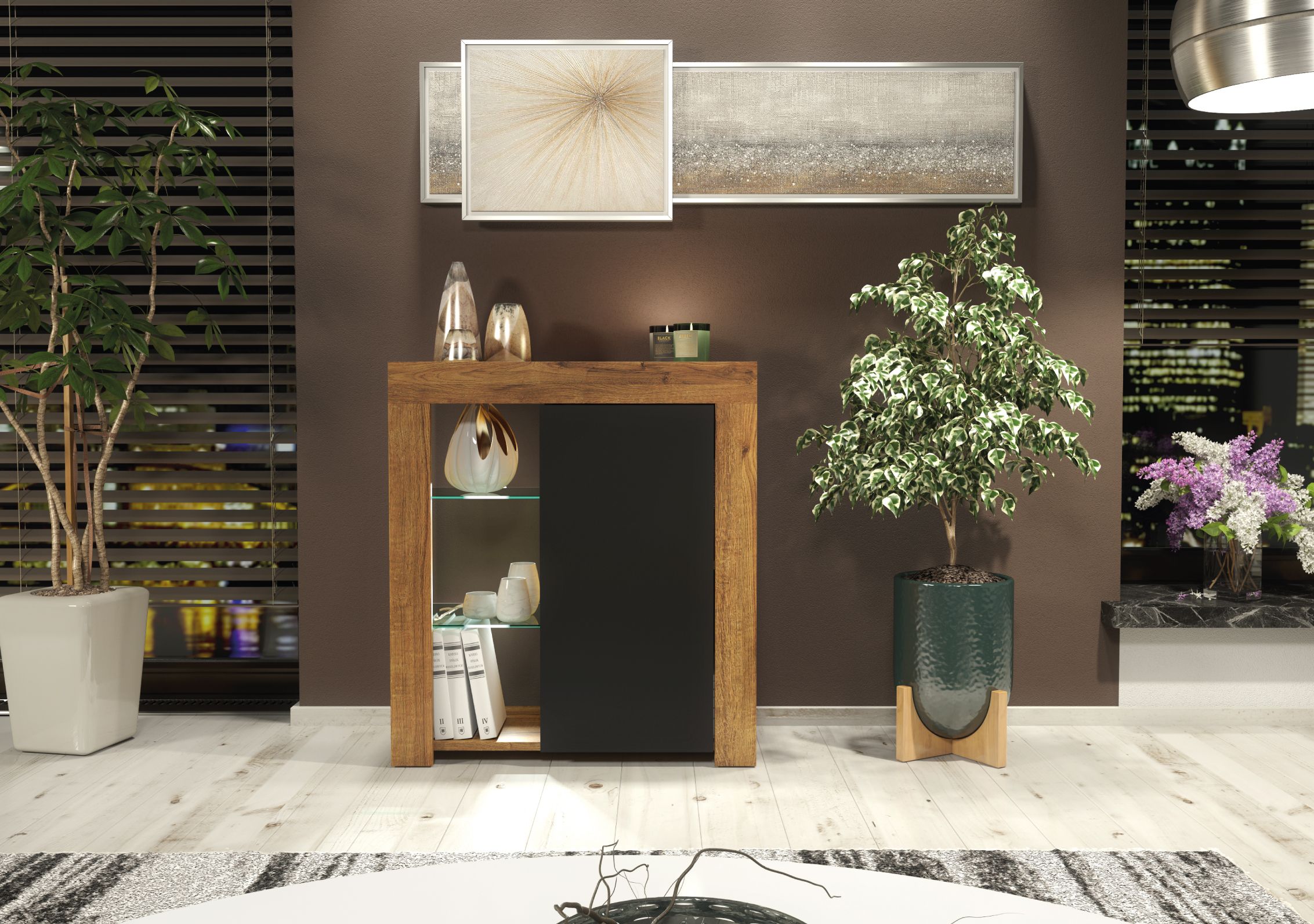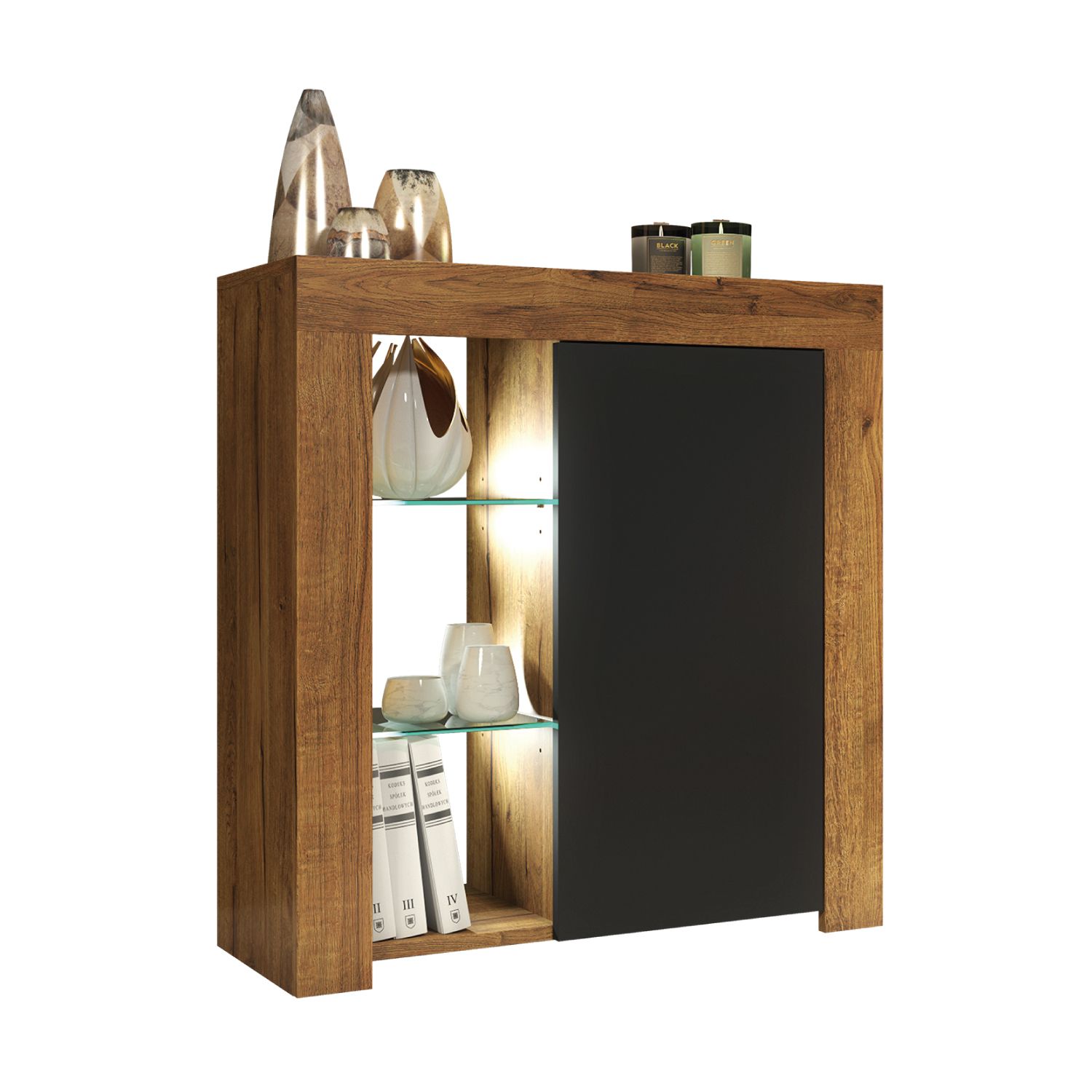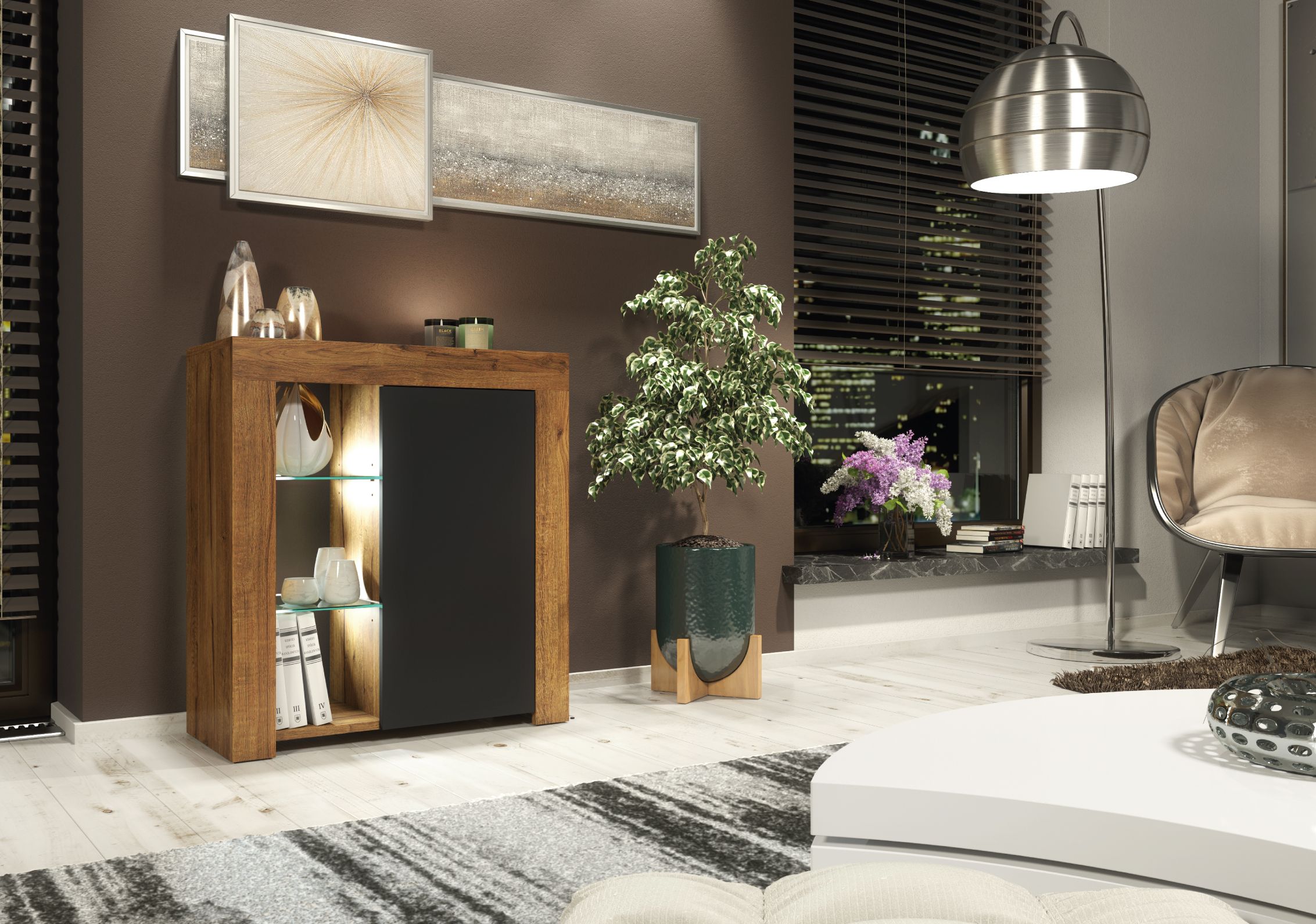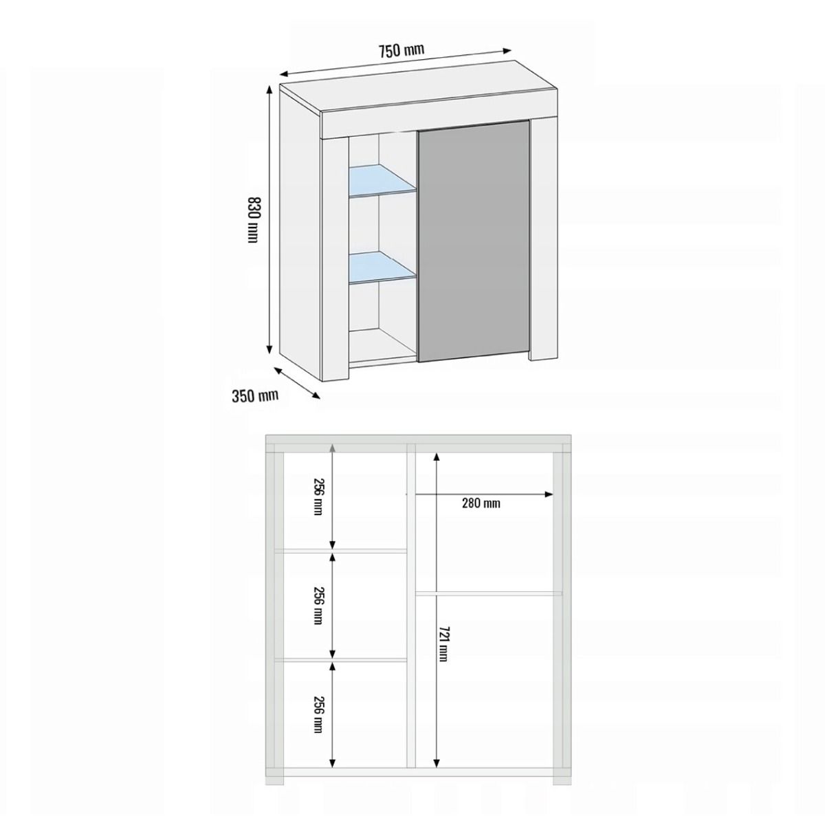 The FLASH Sideboard adds a touch of modern elegance to your home, serving as a stylish yet practical storage solution for smaller spaces. Measuring 75cm (W) x 83cm (H) x 35cm (D), this compact piece enhances both functionality and style, offering ample storage options while fitting seamlessly into any contemporary interior. The matte-finished body is paired with a glossy push-to-open door, which opens effortlessly to reveal a spacious internal compartment, perfect for storing everyday essentials and keeping your space tidy and organized. Available in White & Gloss Doors, White & Grey Gloss Doors, Black & Gloss Doors, Walnut & Black Gloss Doors, Oak & White Gloss Doors, and Dark Grey & Gloss Doors, the FLASH Sideboard is a sophisticated and functional addition to your living space.Please note: the Oak with Black version features matte black doors, providing a subtle and stylish alternative to the glossy finishes in other color combinations.