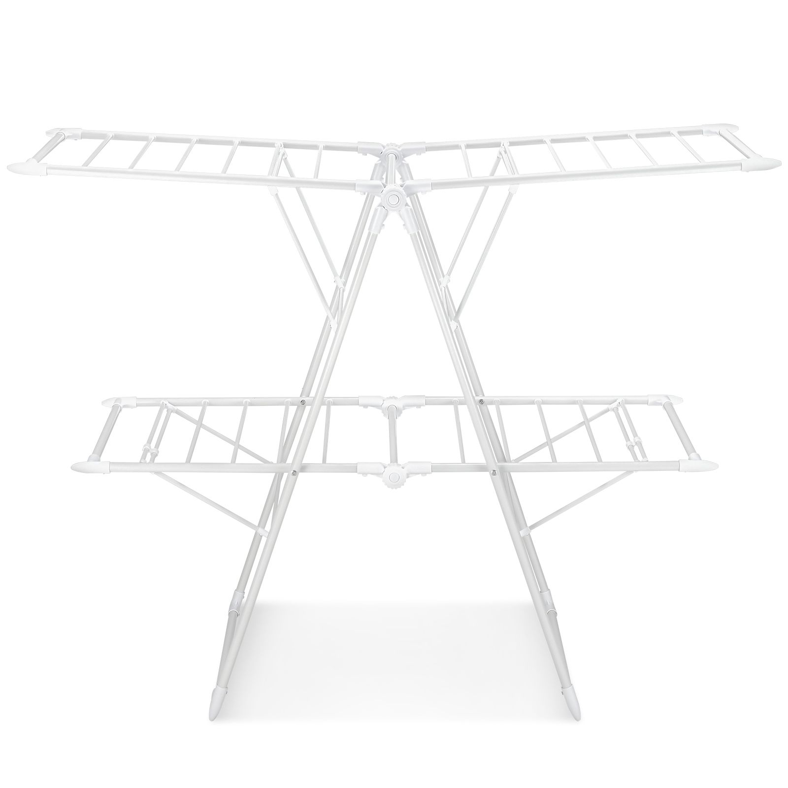 The perfect solution to clothes drying! Equipped with 4 wings and 28 rails, this 2-tier laundry drying rack can meet the clothes drying needs of the whole family. In addition, the top 2 wings can be easily adjusted to 3 heights to dry skirts, pants, sheets and more. The fixing buckle and connector help to keep the wings in place. Crafted from rustproof and waterproof powder-coated steel tubes, this clothes drying rack ensures great stability and long-lasting use. What's more, the laundry drying rack is easy to open and fold up for easy storage. You can store it beside the washing machines or any corner when not in use to save space. 2 Tiers, 4 Wings and 28 Drying Rails: This 2-tier laundry drying rack is equipped with 4 wings and a total of 28 rails, offering large drying space for your clothes, towels, sheets, socks, shoes, underwear, kids' clothes, etc. 3-Level Adjustable Wing Height: The top 2 wings of this freestanding clothes drying rack features 3 adjustable heights (38.5"/98 cm, 44.5"/113 cm, 50.5"/128 cm) to fit different types of clothes. Foldable and Portable Design: Due to the quick folding design, this clothes drying rack is easy to store and can save plenty of space when not in use. Besides, the lightweight design allows you to transport it to the laundry room or the patio with ease. Durable and Stable Construction: Made of powder-coated steel tubes, this laundry drying rack is strong, waterproof and rustproof, ideal for indoor and outdoor use. Plus, the non-slip and anti-wear foot pads enhance stability and durability. No Assembled Required: You don't need to spend time on troublesome assembly. There are no tools required to set up this folding clothes drying rack. It is ready for use after being taken out of the box.