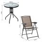 The 3-piece outdoor garden patio furniture set includes a tempered glass-top table and 2 folding chairs. The table base features 4 claw-shaped legs, which makes it sturdy and steady. The folding chair features an adjustable backrest, which allows you to find perfect position to relax. It is an ideal way to enjoy a cafe-style experience right outside your own door.