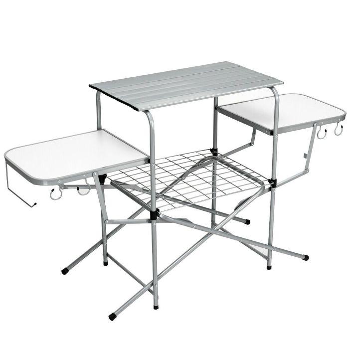 The aluminium folding frame has a central aluminium tabletop, which is suitable for a table BBQ or gas stove, and with 2 MDF side tables and an under mesh table, there is ample room for everything you need, close at hand when cooking. The table also has hooks and a rail for utensils and a cloth. When not in use, the table folds and can be placed into the zippered bag, making storage and transportation easy. Heat-resistant aluminium central tabletop, perfect for a table BBQ or table grill Anti-slip rubber feet for stability Strong steel "X" frame, better stability 1 large central aluminium tabletop, 2 MDS side tables and a lower mesh shelf offers ample space Additional hooks and rail for utensils or cloths Simple, practical designed metal camping table Folds into a zippered bag for ease of storage or transporting Easy to fold and unfold for use