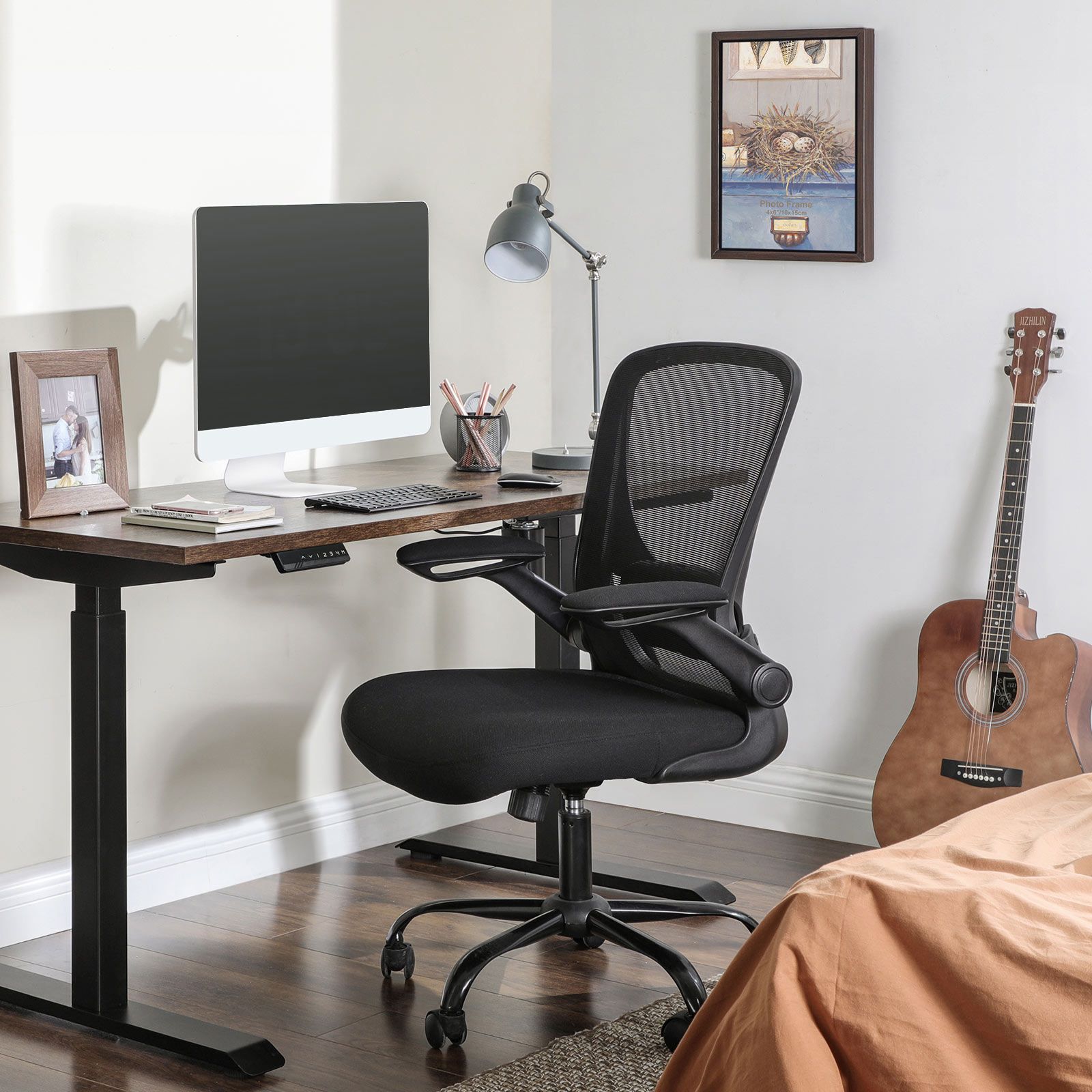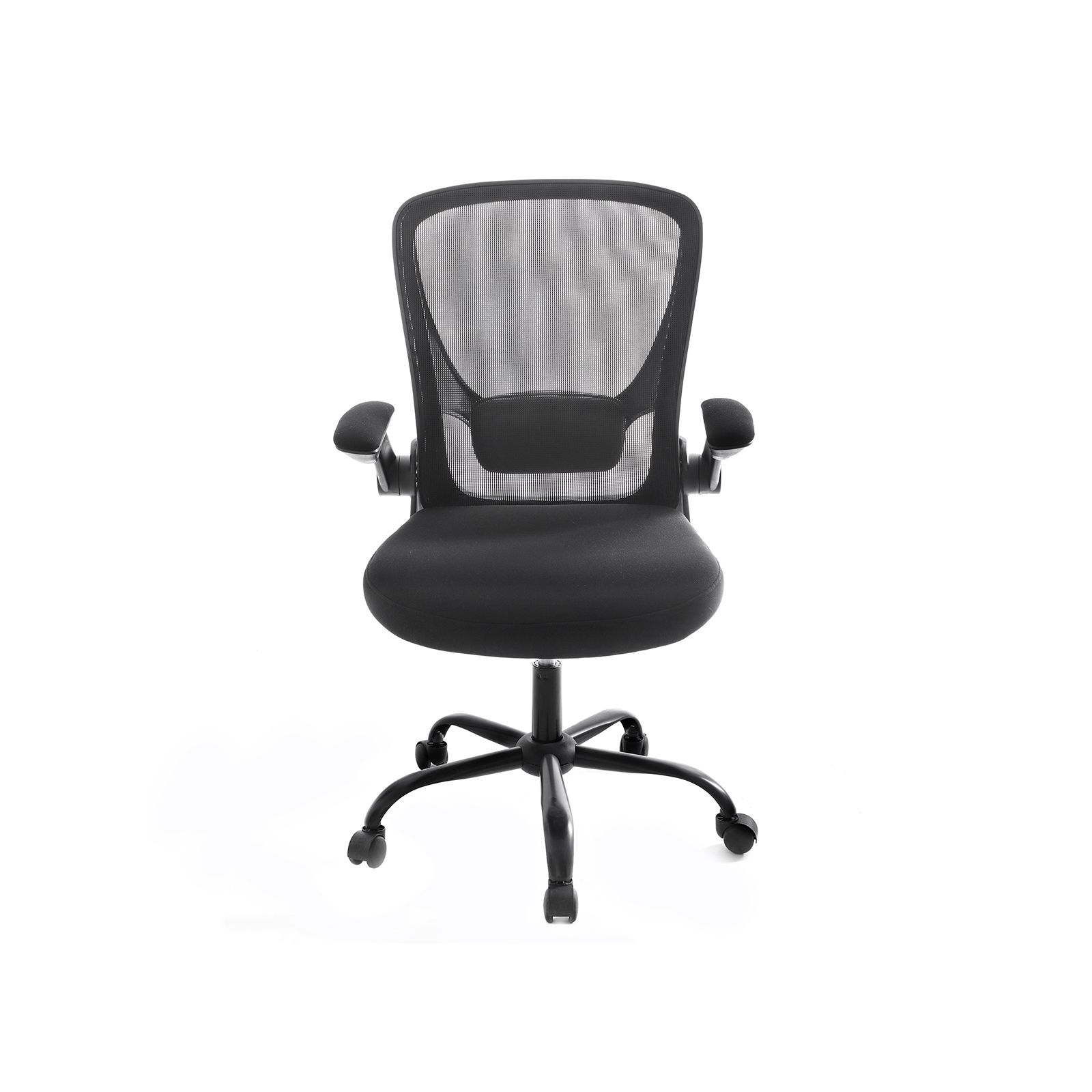 Growth for Your Think Tank: Do the best ideas come to you when you sit at your desk in the evening, a cup of tea and biscuits stand beside you, and the moonlight gently shines into your study? Then don't destroy this creative atmosphere with an uncomfortable desk chair!Treat yourself with this well-padded office chair from and rock back and forth to speed up your thinking process. However, if you need a creative break, you can also lean comfortably against the mesh backrest, while the adjustable lumbar support and wide seat provide firm and comfortable support.Further Advantages of This Office Chair at a Glance:Folding armrests; slide the computer chair under your desk to save spaceSturdy steel base with nylon castors; ensures maximum stability up to 120 kg15° tilt function; adjustable resistanceBreathable mesh fabric