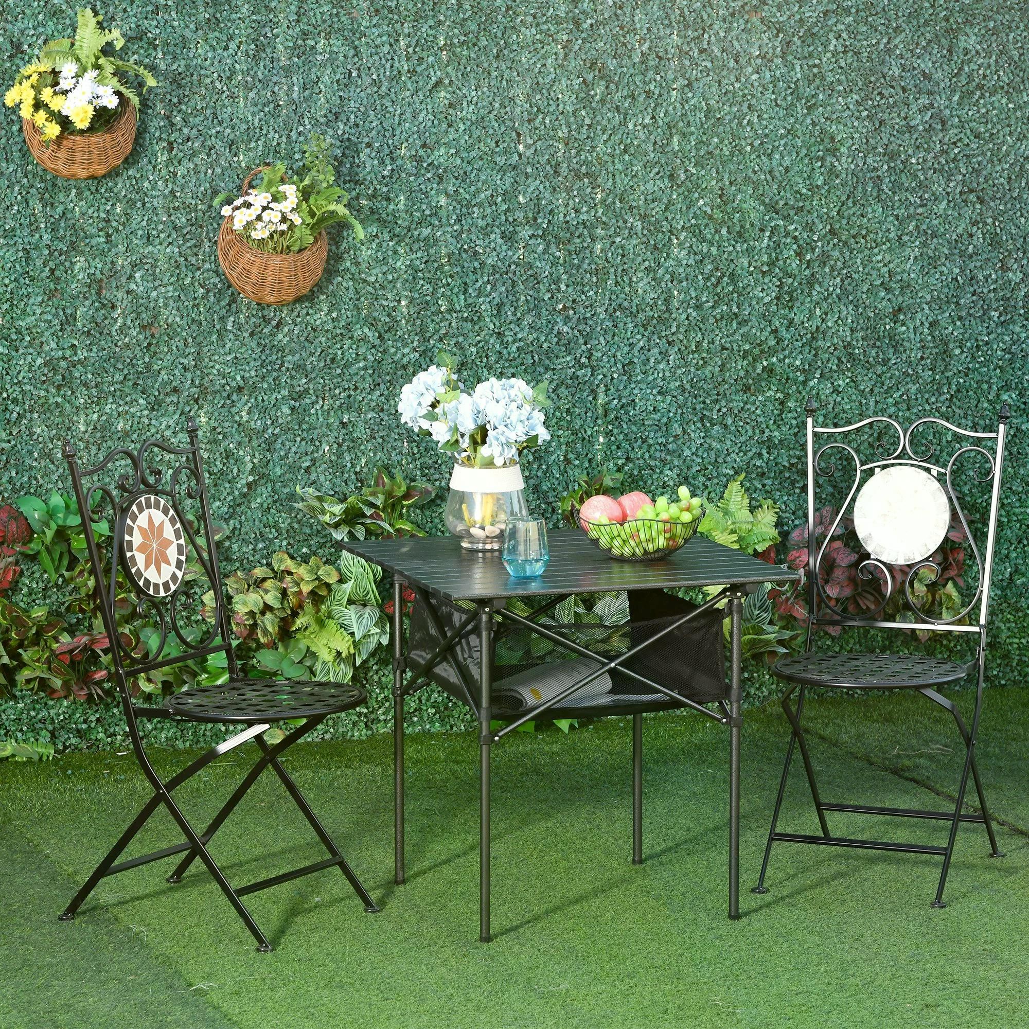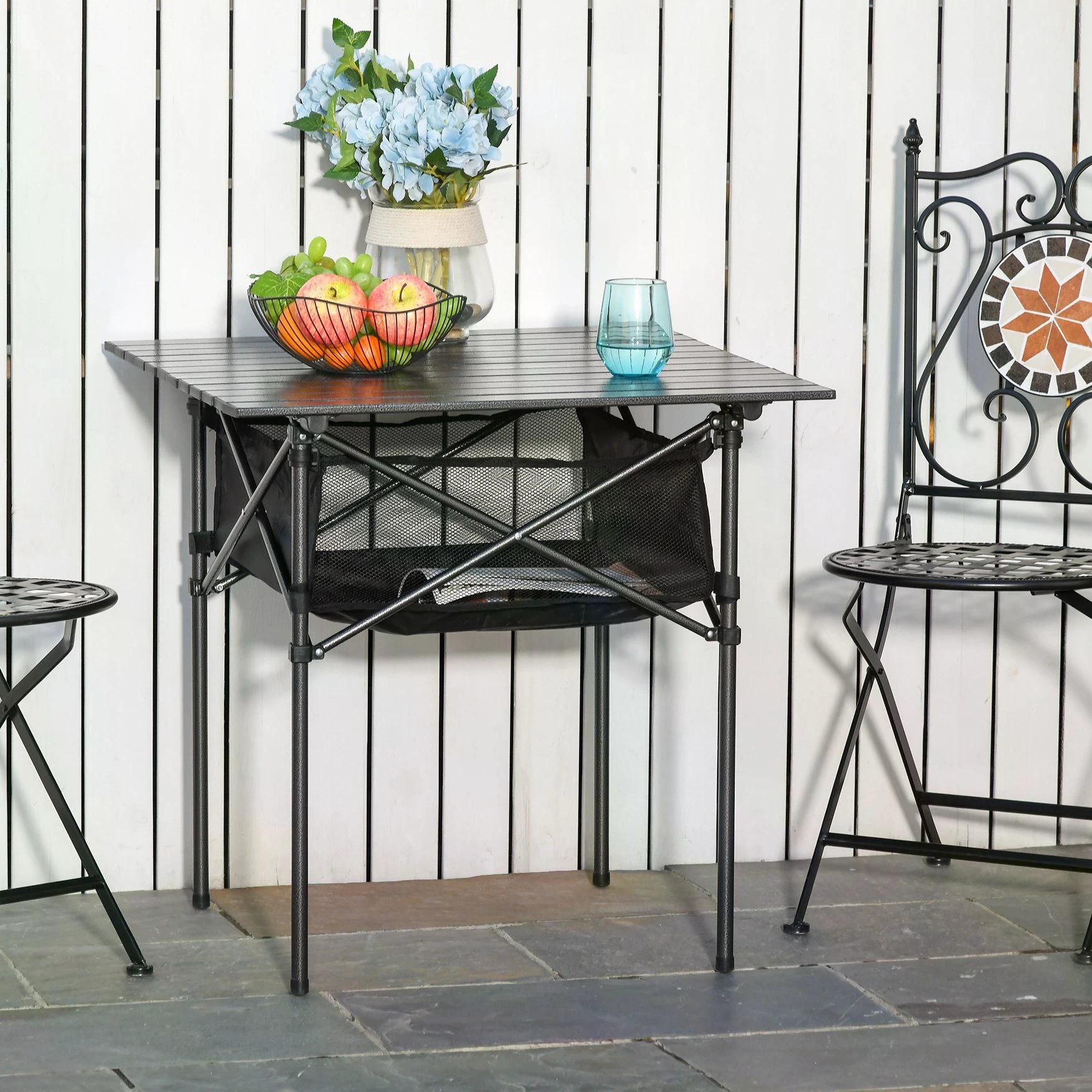 Enhance your outdoor experience with this portable garden table! It can be used as an outdoor dining table, BBQ table, laptop table, gaming table. Perfect for camping, beach, backyard, patio picnic. A mesh basket underneath this table-top to put small garden tools, mobile-phones or other stuff. Surface is made of aluminum, water resistant and stain-resistant. And frame, made from strength steel, makes it sturdy and durable.