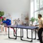 The Mini Tennis Table is ideal for any ping pong lover tight on space. The table stands at regulation height(76cm) with a surface(183cmx91.4xm) of a regulation-sized table. Each half of the table is near a square that can stand alone, perfect for card games or any of your other multi-use table needs. It is suitable for all ages to have a little fun. Just take a short break of work with colleague or play with kids on weekends.