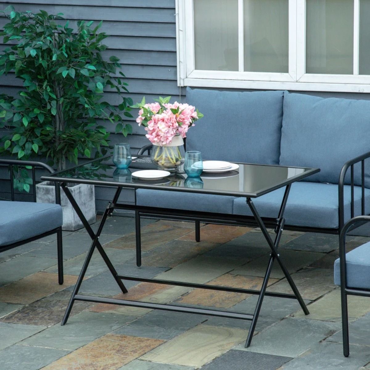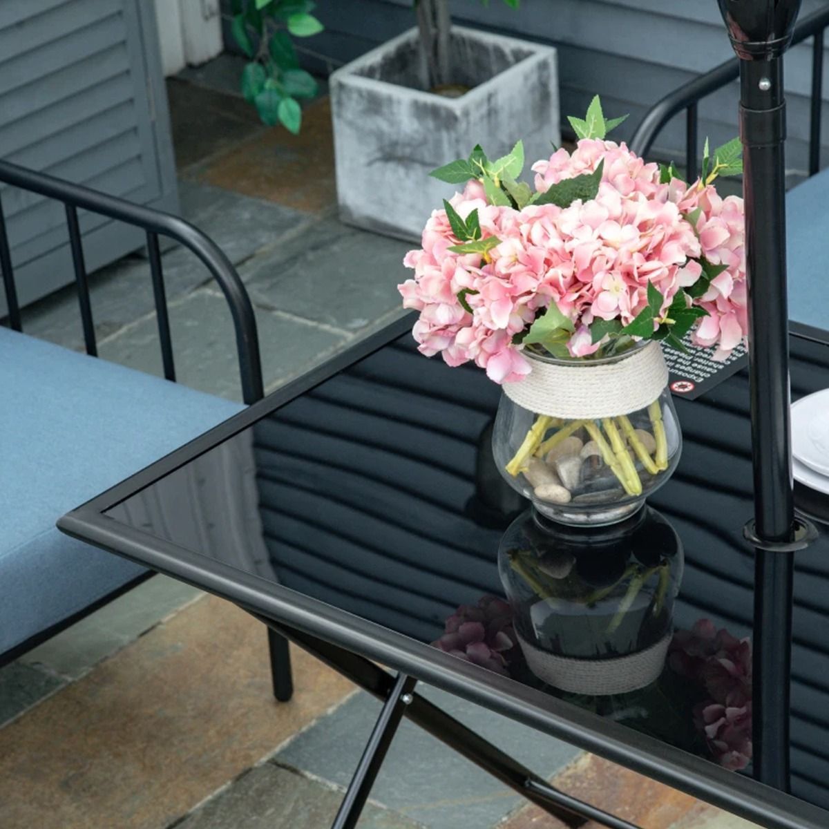 Create a simple yet inviting dining space on any deck or patio with this charming foldable garden dining table . The sturdy metal frame with non-slip foot pads is stable and designed to last for years, and is foldable to compact size for space-saving storage. Featuring a tempered glass tabletop with a parasol hole in the middle to bring a sleek feeling and cool shade. Add enduring beauty, style and grace to your environment with this essential part of any outdoor living space.