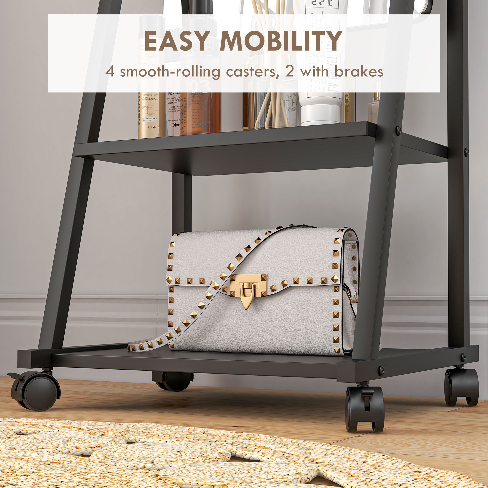 Free Standing Dressing Mirror, Rolling Full Length Mirror on Wheels with Adjustable Angle, Storage Shelves for Bedroom