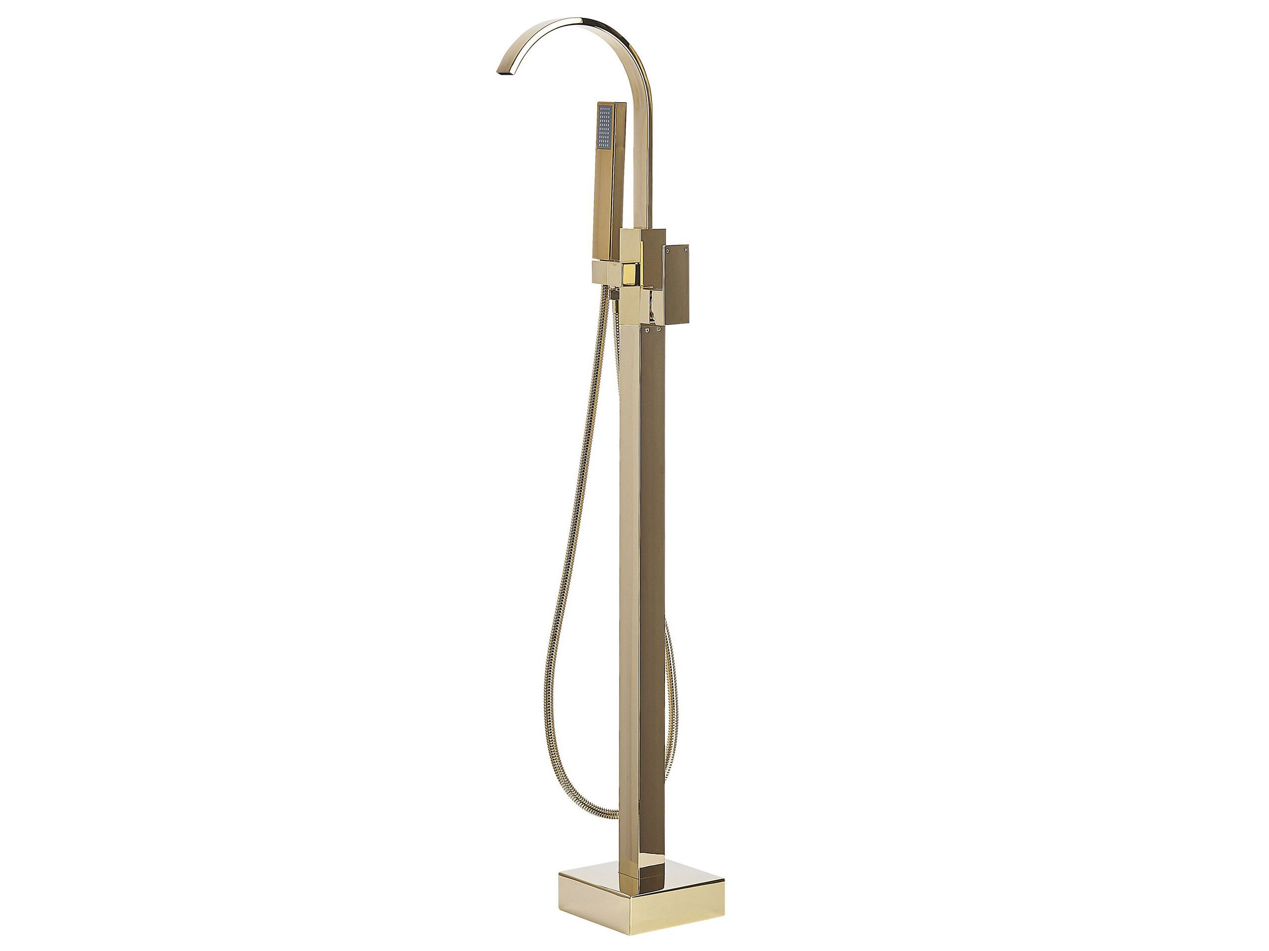 This freestanding bathtub faucet adds a modern touch to every bathroom. Featuring a golden finish, it is made of high-quality brass for durability and easy maintenance. The hand-held shower head and curved mixer tap are convenient to use, while the contemporary design adds a stylish accent to your bathroom. Details: Color: Gold. Main material: Brass. Additional material: Synthetic Material, Stainless Steel, Zinc. Weight: 4 Assembly: Requires Installation and Assembly