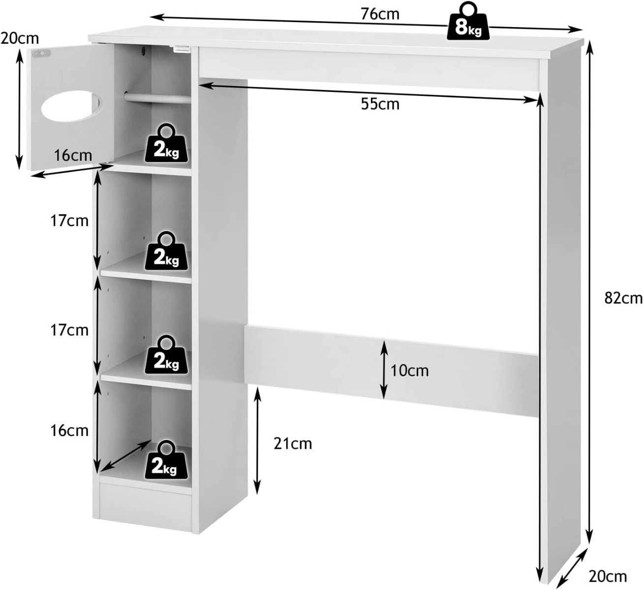 Net Weight: 8 kg Weight capacity of top: 8 kg Weight capacity of each shelf:2 kg Package includes: 1 X Over-the-Toilet storage cabinet 1 X Instruction