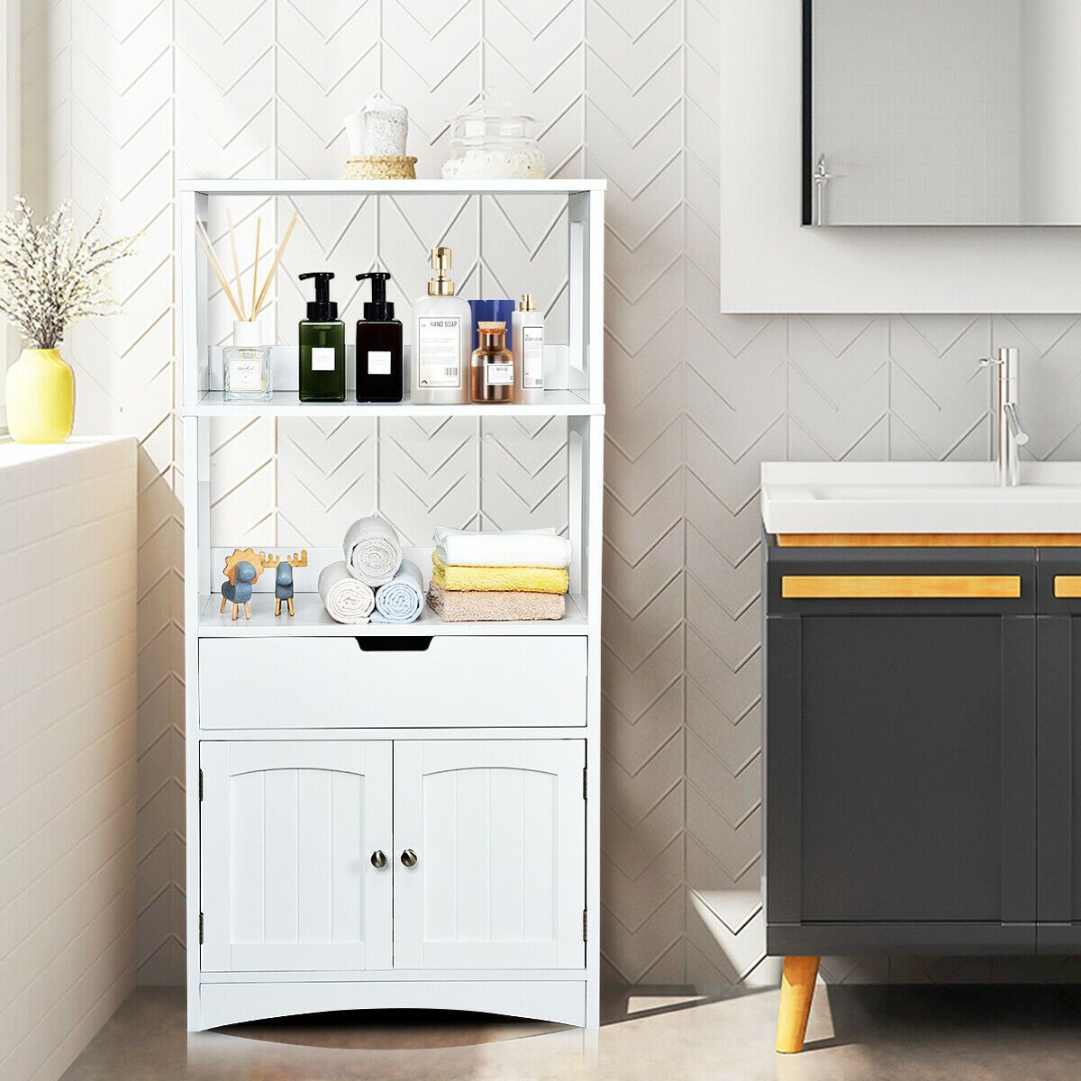 Freestanding Wooden Storage Cabinet with Open Shelves-White