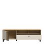 Upgrade your living room with the GABON TV Unit in Cream and Oak. Industrial design, Mauvella oak/Sandy finish, soft-closing system, and drawer on ball bearing slides.
