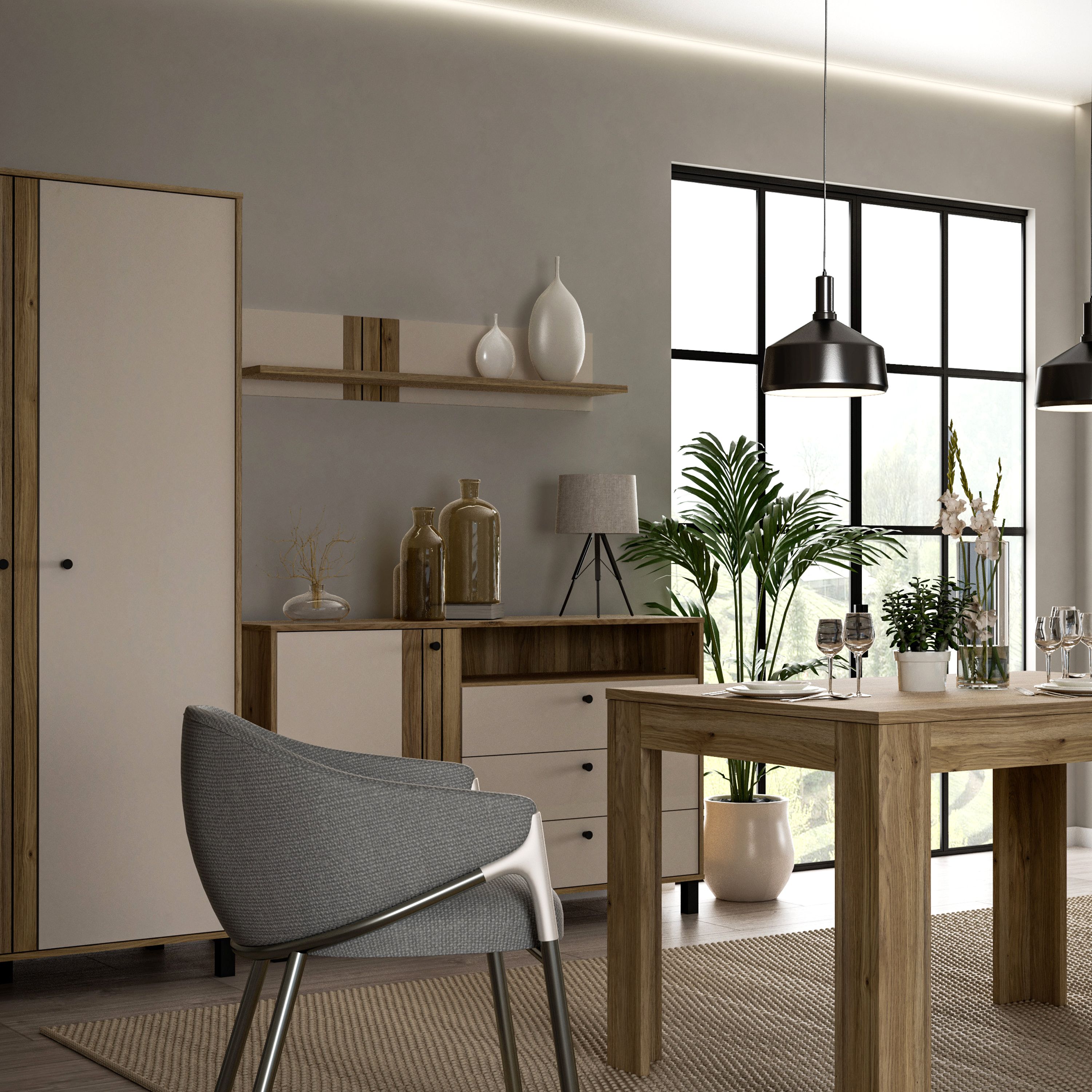 Upgrade your space with the GABON Wall Shelf in Cream and Oak. Industrial design, Mauvella oak/Sandy finish, wall protection, and includes mounting fittings.